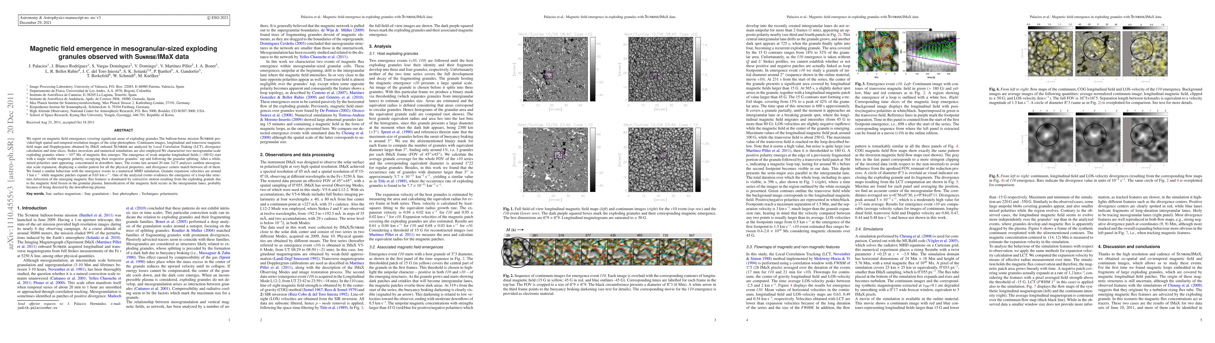 We report on magnetic field emergences covering significant areas of exploding granules. The balloon-borne mission SUNRISE provided high spatial and temporal resolution images of the solar photosphere. Continuum images, longitudinal and transverse magnetic field maps and Dopplergrams obtained by IMaX onboard SUNRISE are analyzed by Local Correlation Traking (LCT), divergence calculation and time slices, Stokes inversions and numerical simulations are also employed. We characterize two mesogranular-scale exploding granules where $\sim$ 10$^{18}$ Mx of magnetic flux emerges. The emergence of weak unipolar longitudinal fields ($\sim$100 G) start with a single visible magnetic polarity, occupying their respective granules' top and following the granular splitting. After a while, mixed polarities start appearing, concentrated in downflow lanes. The events last around 20 min. LCT analyses confirm mesogranular scale expansion, displaying a similar pattern for all the physical properties, and divergence centers match between all of them. We found a similar behaviour with the emergence events in a numerical MHD simulation. Granule expansion velocities are around 1 \kms while magnetic patches expand at 0.65 \kms. One of the analyzed events evidences the emergence of a loop-like structure. Advection of the emerging magnetic flux features is dominated by convective motion resulting from the exploding granule due to the magnetic field frozen in the granular plasma. Intensification of the magnetic field occurs in the intergranular lanes, probably because of being directed by the downflowing plasma.