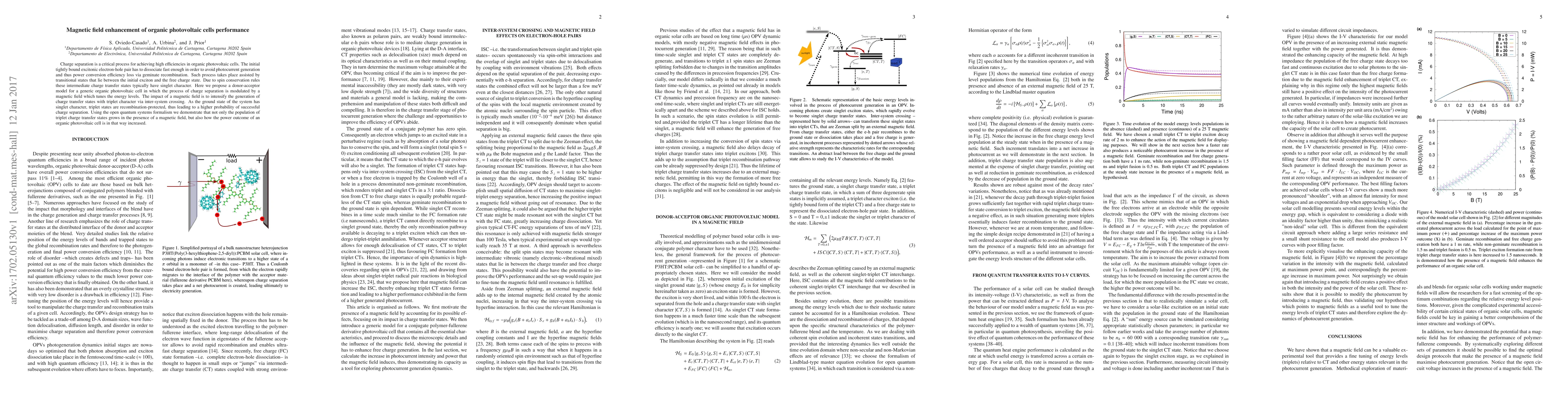 This paper proposes that applying a magnetic field can enhance the performance of organic photovoltaic cells by increasing the generation of triplet charge transfer states, which are protected from recombination, thereby improving charge separation and overall power conversion efficiency. The study uses open quantum systems formalism to demonstrate this enhancement.