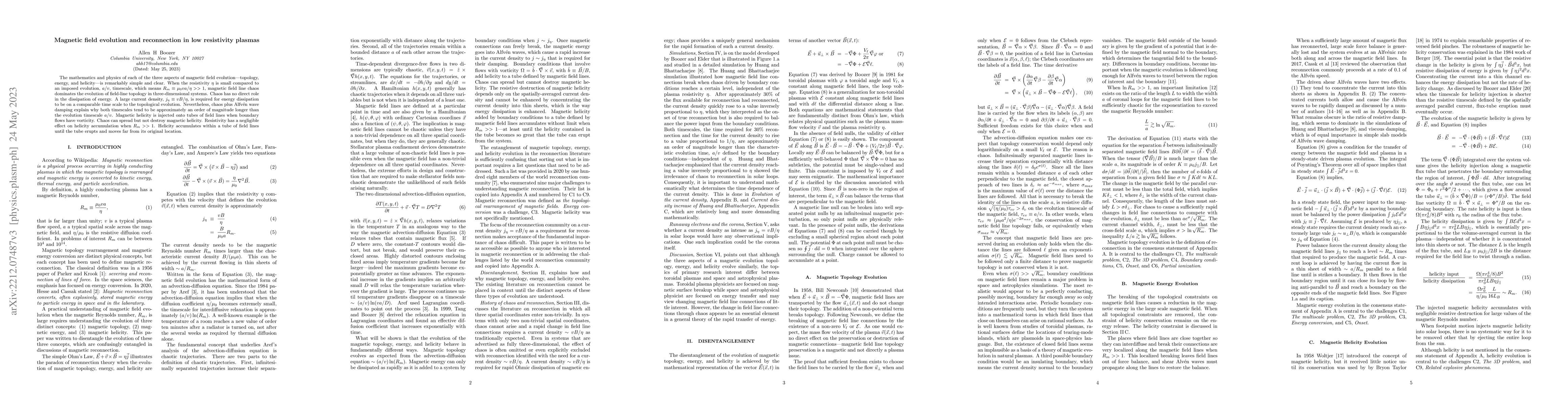 This paper explores the dynamics of magnetic field evolution in low resistivity plasmas, emphasizing the dominance of magnetic field line chaos in topology changes, the role of resistivity in energy dissipation, and the accumulation and spread of magnetic helicity without significant destruction.