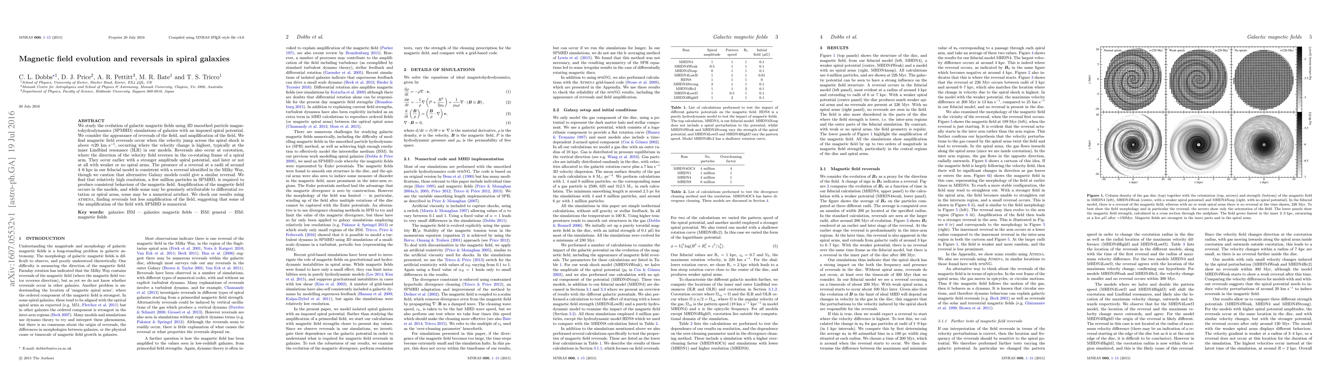 We study the evolution of galactic magnetic fields using 3D smoothed particle magnetohydrodynamics (SPMHD) simulations of galaxies with an imposed spiral potential. We consider the appearance of reversals of the field, and amplification of the field. We find magnetic field reversals occur when the velocity jump across the spiral shock is above $\approx$20km s$^{-1}$, occurring where the velocity change is highest, typically at the inner Lindblad resonance (ILR) in our models. Reversals also occur at corotation, where the direction of the velocity field reverses in the co-rotating frame of a spiral arm. They occur earlier with a stronger amplitude spiral potential, and later or not at all with weaker or no spiral arms. The presence of a reversal at a radii of around 4--6 kpc in our fiducial model is consistent with a reversal identified in the Milky Way, though we caution that alternative Galaxy models could give a similar reversal. We find that relatively high resolution, a few million particles in SPMHD, is required to produce consistent behaviour of the magnetic field. Amplification of the magnetic field occurs in the models, and while some may be genuinely attributable to differential rotation or spiral arms, some may be a numerical artefact. We check our results using Athena, finding reversals but less amplification of the field, suggesting that some of the amplification of the field with SPMHD is numerical.