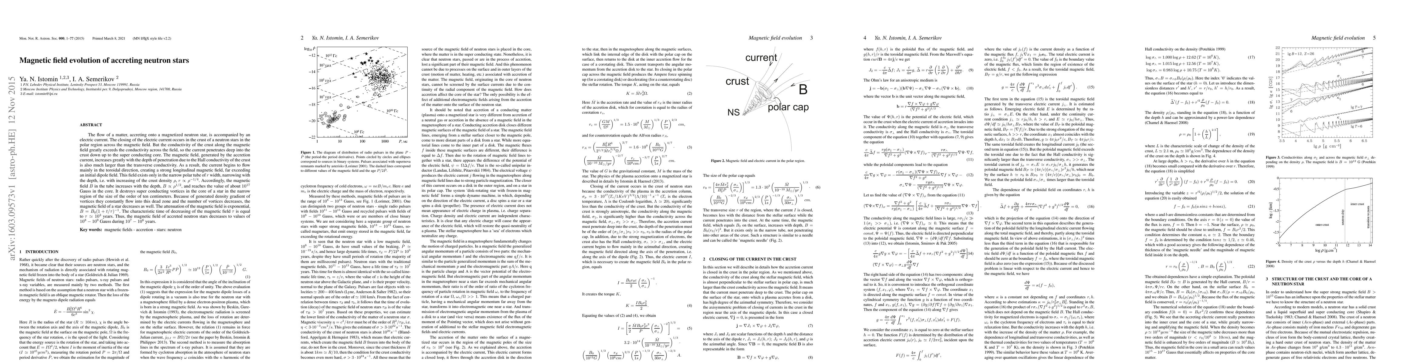 This paper investigates the evolution of magnetic fields in accreting neutron stars, showing that accretion currents create strong longitudinal magnetic fields in the narrow polar regions. The magnetic field increases exponentially with depth, reaching up to $10^{17}$ Gauss in the core, but decreases exponentially over $10^3$ years to $10^8 - 10^9$ Gauss due to vortex destruction.