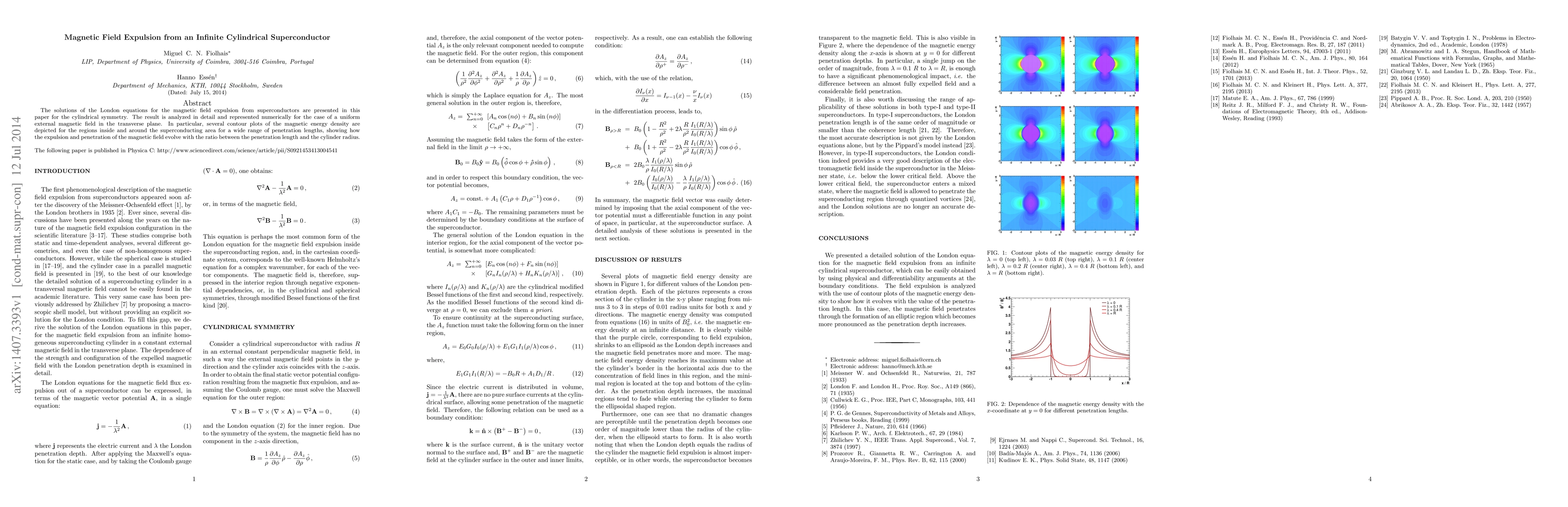 The solutions of the London equations for the magnetic field expulsion from superconductors are presented in this paper for the cylindrical symmetry. The result is analyzed in detail and represented numerically for the case of a uniform external magnetic field in the transverse plane. In particular, several contour plots of the magnetic energy density are depicted for the regions inside and around the superconducting area for a wide range of penetration lengths, showing how the expulsion and penetration of the magnetic field evolve with the ratio between the penetration length and the cylinder radius.