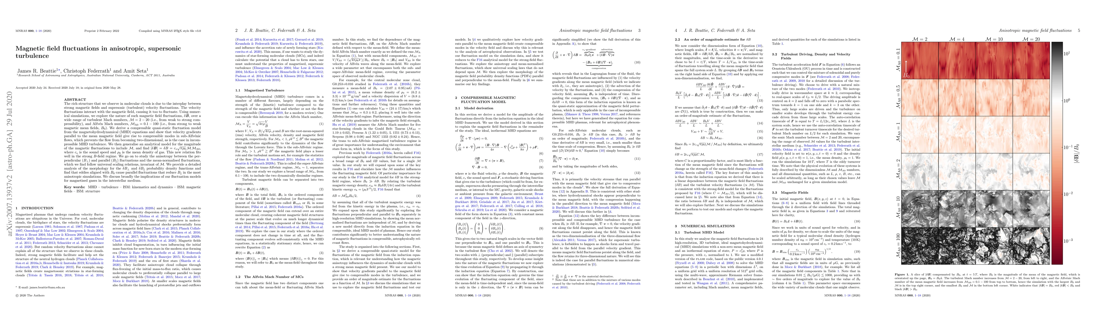 This paper investigates magnetic field fluctuations in anisotropic, supersonic turbulence using numerical simulations. It derives a compressible quasi-static fluctuation model from MHD equations, showing that velocity gradients parallel to the magnetic field prevent two-dimensional flow. The study finds a new relation for magnetic fluctuation magnitudes and analyzes anisotropy between perpendicular and parallel fluctuations, revealing universal scaling relations and implications for magnetised interstellar medium gases.