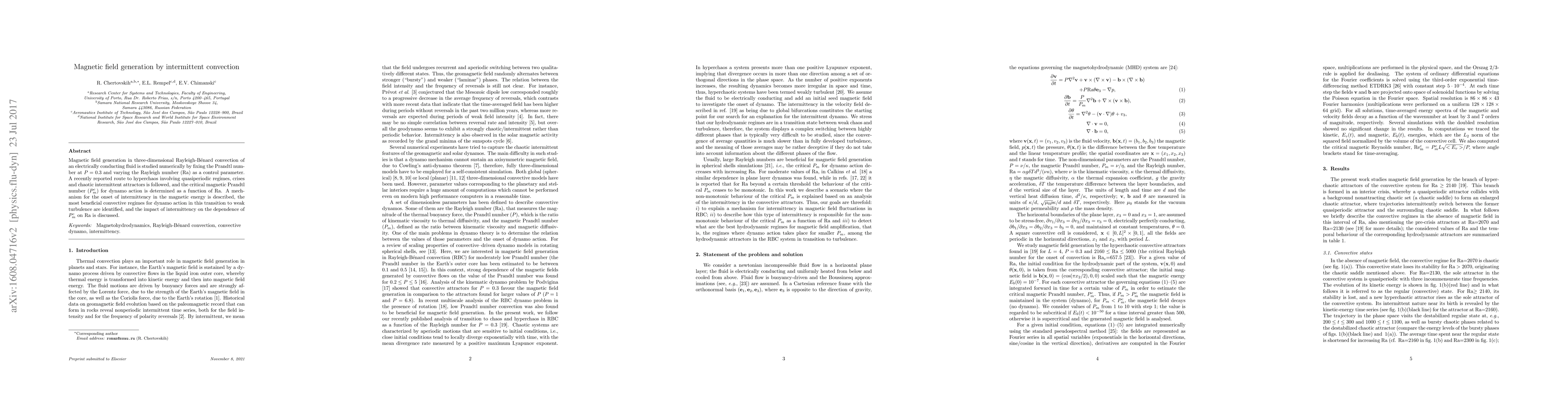 Magnetic field generation in three-dimensional Rayleigh-B\'enard convection of an electrically conducting fluid is studied numerically by fixing the Prandtl number at $P=0.3$ and varying the Rayleigh number (Ra) as a control parameter. A recently reported route to hyperchaos involving quasiperiodic regimes, crises and chaotic intermittent attractors is followed, and the critical magnetic Prandtl number ($P_m^c$) for dynamo action is determined as a function of Ra. A mechanism for the onset of intermittency in the magnetic energy is described, the most beneficial convective regimes for dynamo action in this transition to weak turbulence are identified, and the impact of intermittency on the dependence of $P_m^c$ on Ra is discussed.