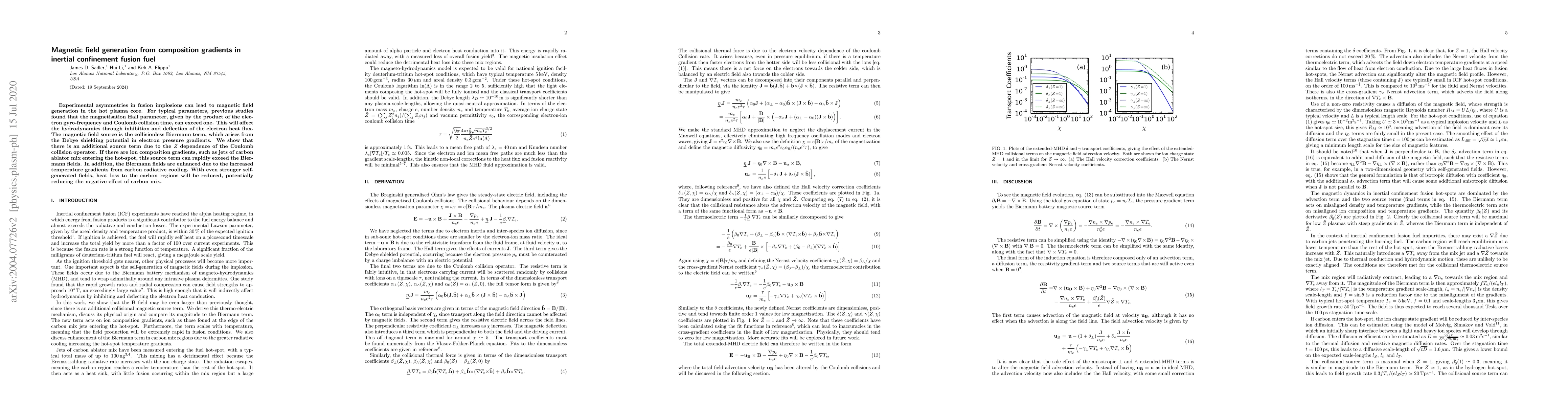 Experimental asymmetries in fusion implosions can lead to magnetic field generation in the hot plasma core. For typical parameters, previous studies found that the magnetisation Hall parameter, given by the product of the electron gyro-frequency and Coulomb collision time, can exceed one. This will affect the hydrodynamics through inhibition and deflection of the electron heat flux. The magnetic field source is the collisionless Biermann term, which arises from the Debye shielding potential in electron pressure gradients. We show that there is an additional source term due to the Z dependence of the Coulomb collision operator. If there are ion composition gradients, such as jets of carbon ablator mix entering the hot-spot, this source term can rapidly exceed the Biermann fields. In addition, the Biermann fields are enhanced due to the increased temperature gradients from carbon radiative cooling. With even stronger self-generated fields, heat loss to the carbon regions will be reduced, potentially reducing the negative effect of carbon mix.