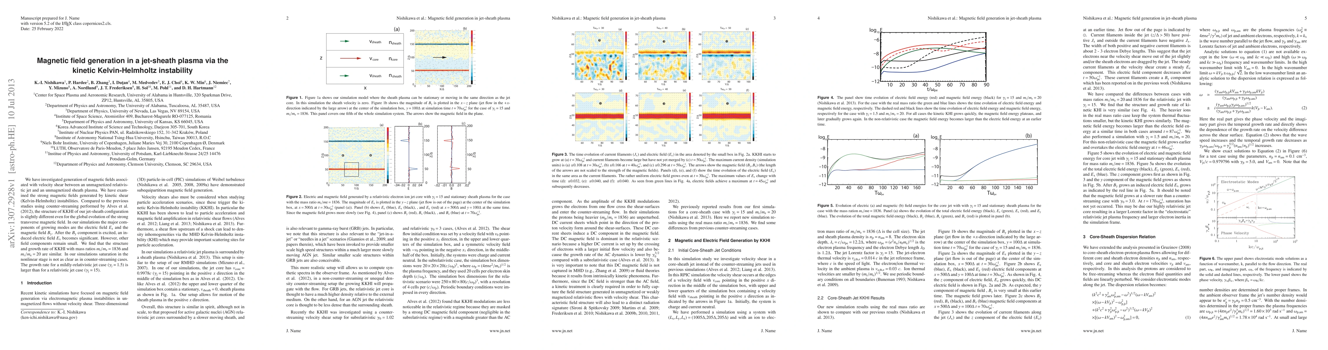 This paper investigates the generation of magnetic fields in a relativistic jet-sheath plasma via kinetic Kelvin-Helmholtz instabilities, finding that the $B_{\rm y}$ magnetic field component grows significantly, followed by an induced $E_{\rm x}$ electric field, while the growth rate for mildly-relativistic jets is higher than for highly relativistic jets.