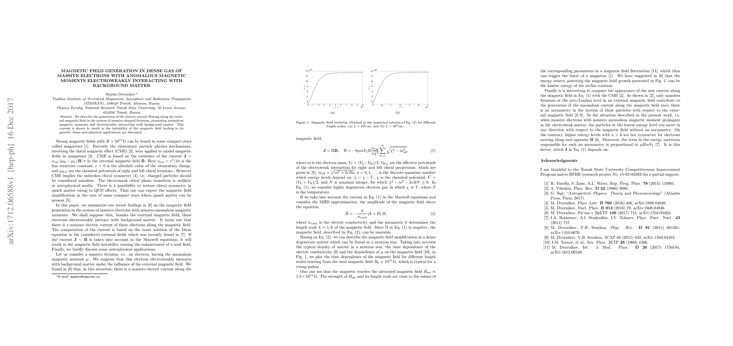 This paper investigates how electric currents in a dense gas of massive electrons with anomalous magnetic moments, electroweakly interacting with background matter, generate and amplify magnetic fields, potentially leading to instabilities. Astrophysical implications of this magnetic field growth are also considered.