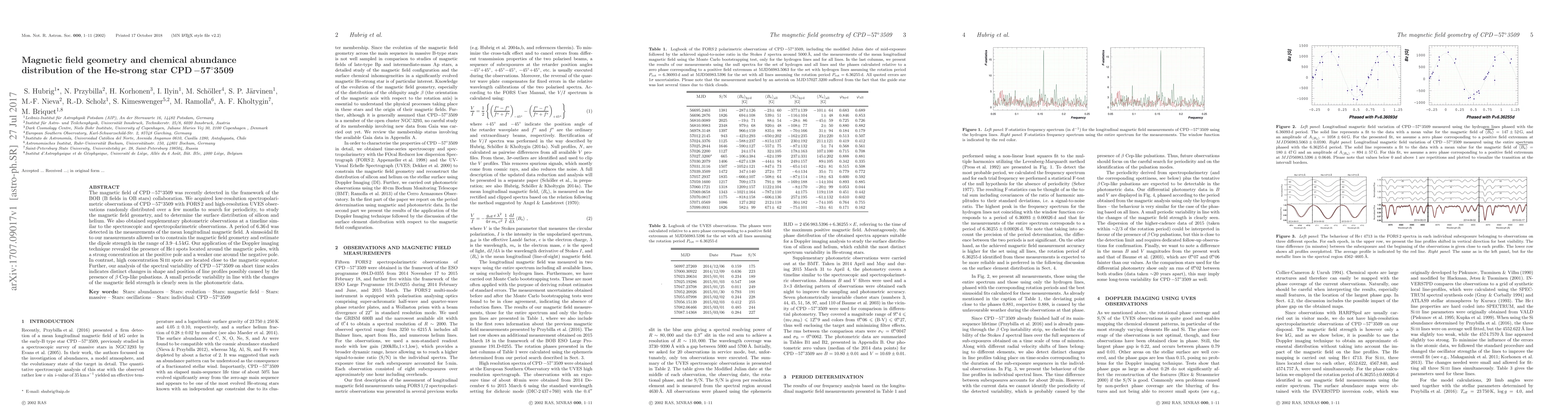 The magnetic field of CPD -57 3509 was recently detected in the framework of the BOB (B fields in OB stars) collaboration. We acquired low-resolution spectropolarimetric observations of CPD -57 3509 with FORS2 and high-resolution UVES observations randomly distributed over a few months to search for periodicity, to study the magnetic field geometry, and to determine the surface distribution of silicon and helium. We also obtained supplementary photometric observations at a timeline similar to the spectroscopic and spectropolarimetric observations. A period of 6.36d was detected in the measurements of the mean longitudinal magnetic field. A sinusoidal fit to our measurements allowed us to constrain the magnetic field geometry and estimate the dipole strength in the range of 3.9-4.5kG. Our application of the Doppler imaging technique revealed the presence of He I spots located around the magnetic poles, with a strong concentration at the positive pole and a weaker one around the negative pole. In contrast, high concentration Si III spots are located close to the magnetic equator. Further, our analysis of the spectral variability of CPD -57 3509 on short time scales indicates distinct changes in shape and position of line profiles possibly caused by the presence of beta Cep-like pulsations. A small periodic variability in line with the changes of the magnetic field strength is clearly seen in the photometric data.