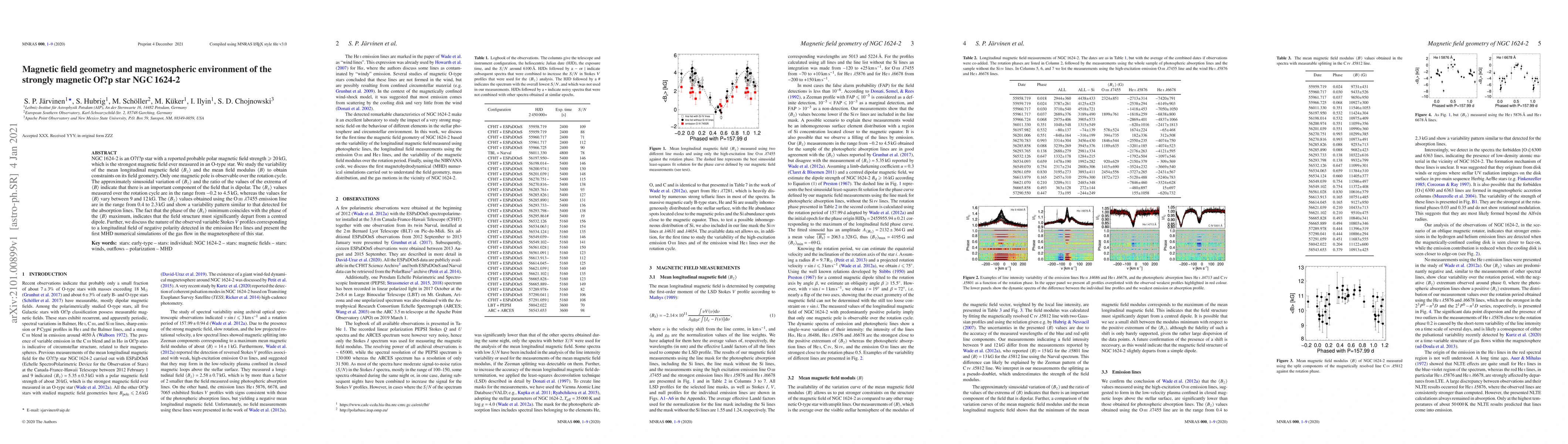 NGC 1624-2 is an O7f?p star with a reported probable polar magnetic field strength $\ge$ 20 kG, which is the strongest magnetic field ever measured in an O-type star. We study the variability of the mean longitudinal magnetic field $\langle B_z \rangle$ and the mean field modulus $\langle B \rangle$ to obtain constraints on its field geometry. Only one magnetic pole is observable over the rotation cycle. The approximately sinusoidal variation of $\langle B_z \rangle$ and the ratio of the values of the extrema of $\langle B \rangle$ indicate that there is an important component of the field that is dipolar. The $\langle B_z \rangle$ values measured over the rotation cycle are in the range from $-0.2$ to 4.5 kG, whereas the values for $\langle B \rangle$ vary between 9 and 12 kG. The $\langle B_z \rangle$ values obtained using the O III $\lambda$7455 emission line are in the range from 0.4 to 2.3 kG and show a variability pattern similar to that detected for the absorption lines. The fact that the phase of the $\langle B_z \rangle$ minimum coincides with the phase of the $\langle B \rangle$ maximum, indicates that the field structure must significantly depart from a centred dipole. Further, we discuss the nature of the observed variable Stokes $V$ profiles corresponding to a longitudinal field of negative polarity detected in the emission He I lines and present the first MHD numerical simulations of the gas flow in the magnetosphere of this star.