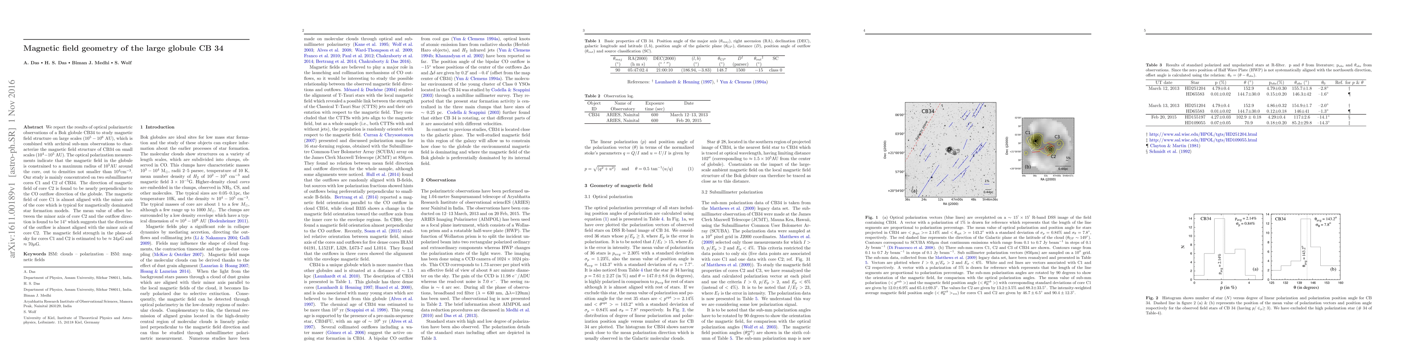 This study examines the magnetic field structure of the Bok globule CB34 using optical polarimetric observations and sub-mm data, revealing that the field is confined within 10^5 AU around the core and estimating field strengths of ~34u03bcG and ~70u03bcG for cores C1 and C2, respectively. The magnetic field orientation suggests different star formation dynamics in each core.