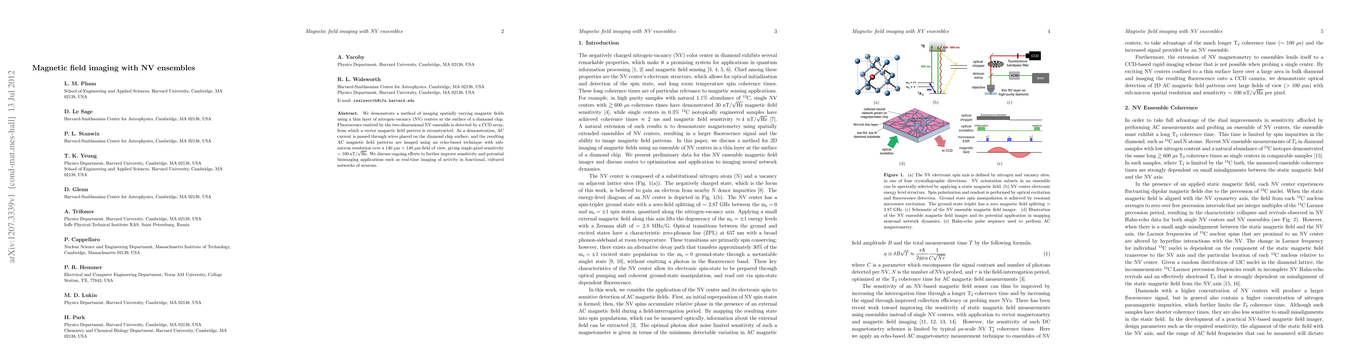 This paper presents a method for imaging magnetic fields using NV centers in diamond, utilizing fluorescence detection to reconstruct vector magnetic field patterns with sub-micron resolution. The technique demonstrates imaging of AC magnetic fields generated by currents, with sensitivity of ~100 nT/\sqrt{Hz}, and explores potential bioimaging applications.