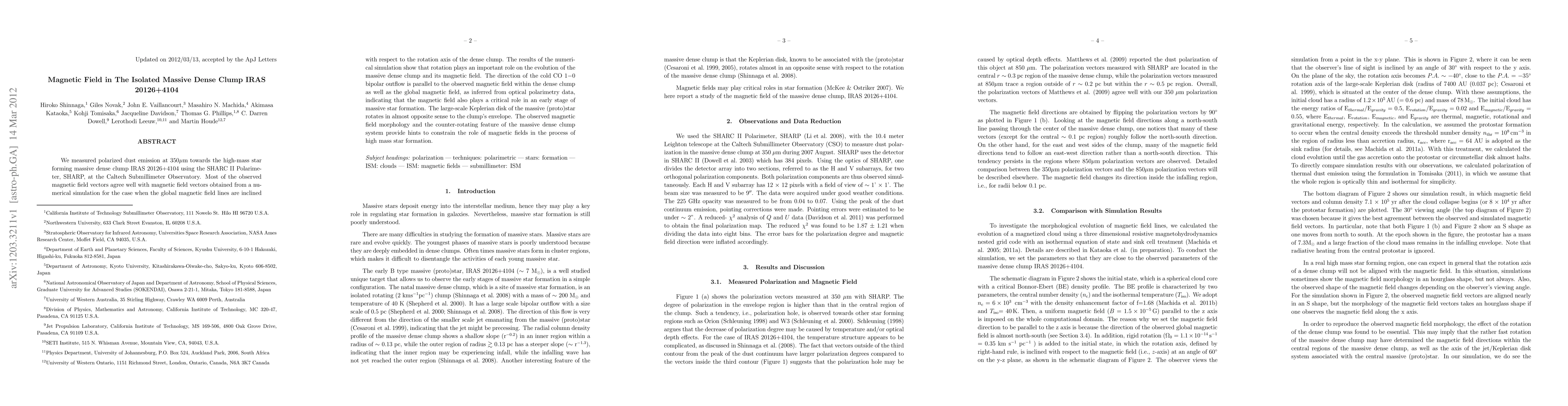 The study measures magnetic fields in the massive dense clump IRAS 20126+4104, finding alignment between the magnetic field, a numerical simulation's global magnetic field lines, and a CO 1-0 bipolar outflow. The results suggest rotation significantly influences the clump's evolution and that magnetic fields play a crucial role in high-mass star formation, with a counter-rotating massive dense clump system hinting at magnetic field processes in high mass star formation.