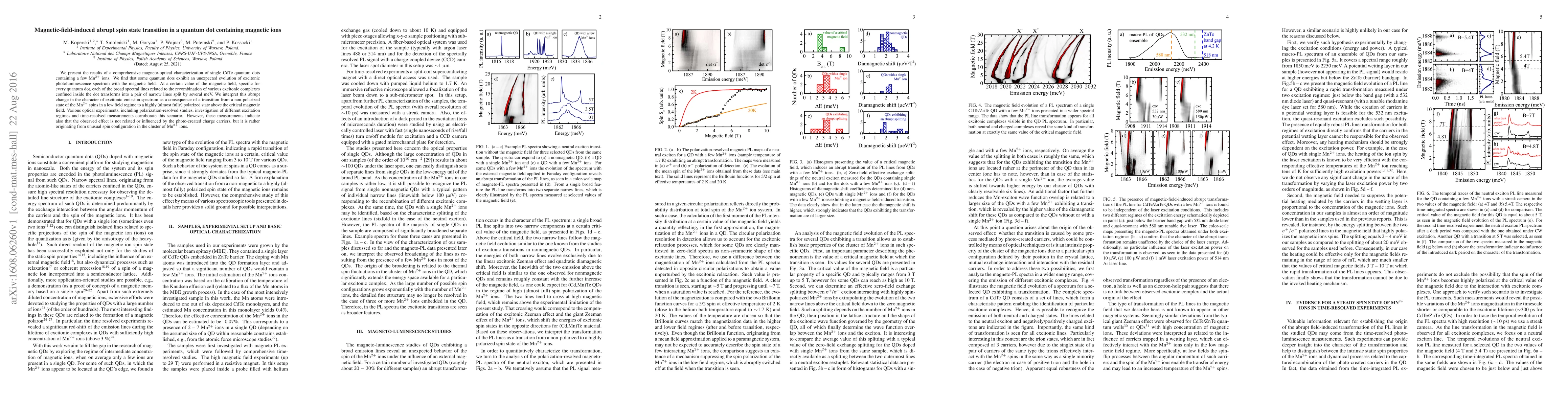This paper reports on the magnetic-field-induced abrupt transition in the spin state of Mn2+ ions within CdTe quantum dots, leading to a dramatic change in excitonic photoluminescence spectrum. The transition is from a non-polarized to a highly polarized state, independent of photo-created charge carriers.