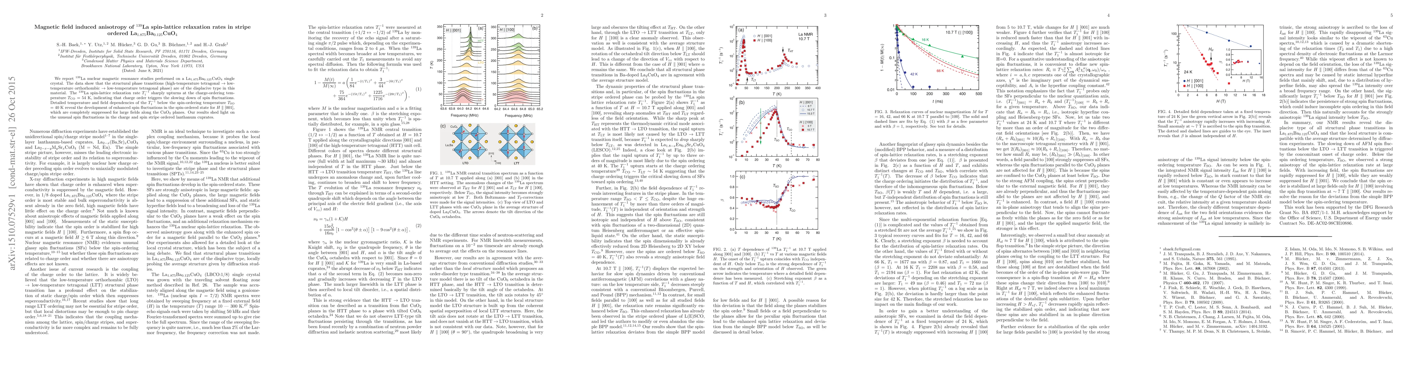 This study reveals how the $^{139}$La spin-lattice relaxation rate in La$_{1.875}$Ba$_{0.125}$CuO$_4$ is affected by magnetic fields and temperature, highlighting enhanced spin fluctuations in the spin-ordered state and their suppression under strong fields aligned with the CuO$_2$ planes. The findings suggest a complex interplay between charge order, spin fluctuations, and magnetic fields in lanthanum cuprates.