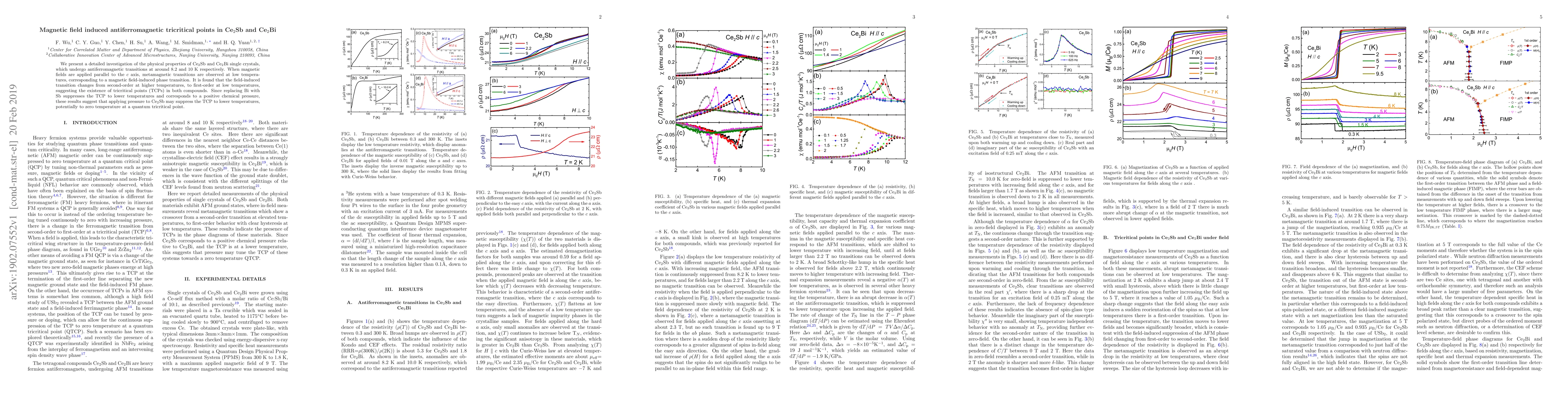 Researchers discovered tricritical points in two compounds, Ce$_2$Sb and Ce$_2$Bi, where magnetic fields induce phase transitions at low temperatures. Applying pressure to Ce$_2$Sb may suppress these points to zero temperature.