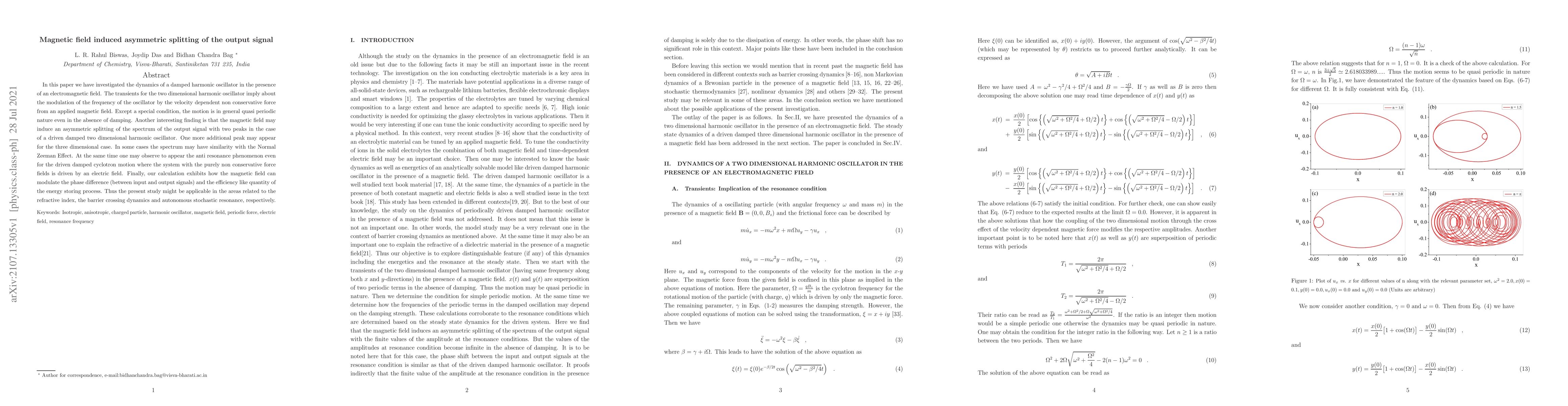 In this paper we have investigated the dynamics of a damped harmonic oscillator in the presence of an electromagnetic field. The transients for the two dimensional harmonic oscillator imply about the modulation of the frequency of the oscillator by the velocity dependent non conservative force from an applied magnetic field. Except a special condition, the motion is in general quasi periodic nature even in the absence of damping. Another interesting finding is that the magnetic field may induce an asymmetric splitting of the spectrum of the output signal with two peaks in the case of a driven damped two dimensional harmonic oscillator. One more additional peak may appear for the three dimensional case. In some cases the spectrum may have similarity with the Normal Zeeman Effect. At the same time one may observe to appear the anti resonance phenomenon even for the driven damped cyclotron motion where the system with the purely non conservative force fields is driven by an electric field. Finally, our calculation exhibits how the magnetic field can modulate the phase difference (between input and output signals) and the efficiency like quantity of the energy storing process. Thus the present study might be applicable in the areas related to the refractive index, the barrier crossing dynamics and autonomous stochastic resonance, respectively.