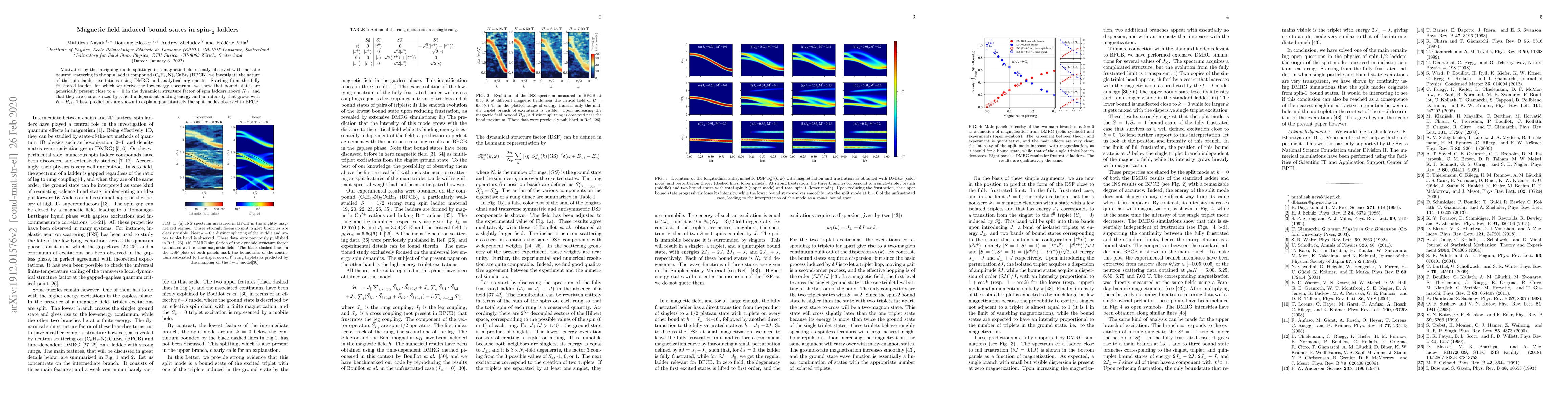This paper investigates spin-$\frac{1}{2}$ ladders under a magnetic field, revealing the presence of bound states near $k=0$ in the dynamical structure factor, characterized by a field-independent binding energy and intensity increasing with field strength. These findings quantitatively explain the observed split modes in the compound (C$_5$H$_{12}$N)$_2$CuBr$_4$ (BPCB).