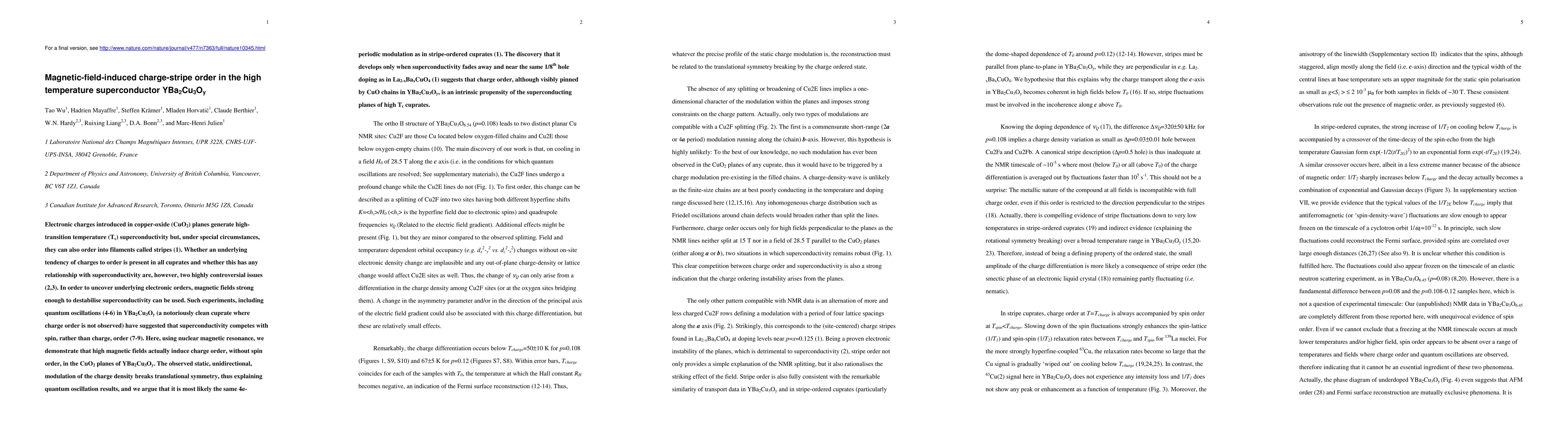 This study reveals that high magnetic fields induce charge-stripe order in YBa2Cu3Oy, a high-temperature superconductor, without accompanying spin order. The observed charge modulation, which breaks translational symmetry, suggests an intrinsic tendency for charge order in superconducting copper-oxide planes, hinting at a deeper connection to superconductivity.