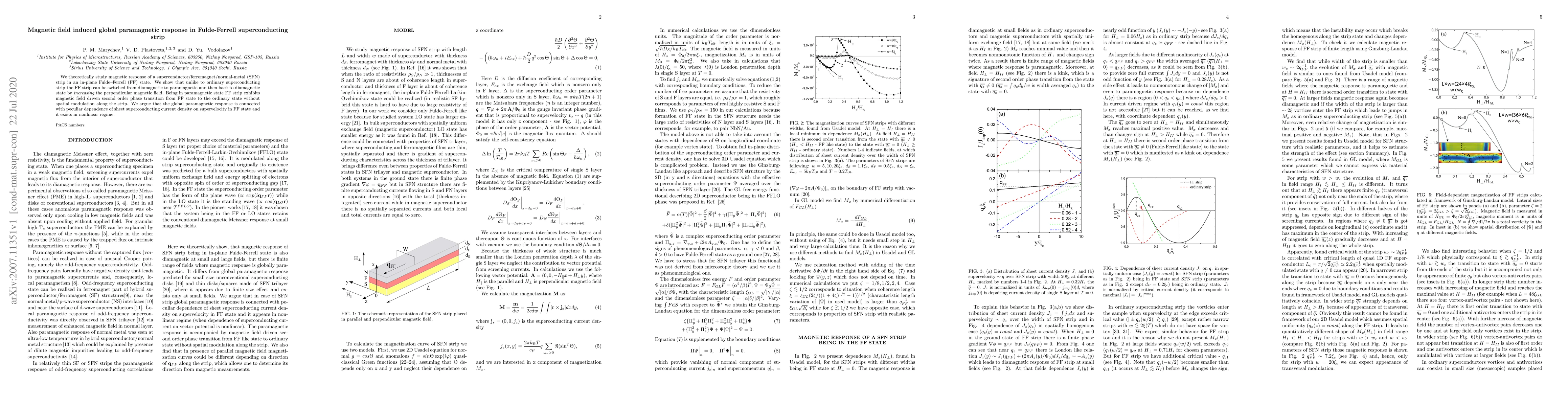 We theoretically study magnetic response of a superconductor/ferromagnet/normal-metal (SFN) strip in an in-plane Fulde--Ferrell (FF) state. We show that unlike to ordinary superconducting strip the FF strip can be switched from diamagnetic to paramagnetic and then back to diamagnetic state by {\it increasing} the perpendicular magnetic field. Being in paramagnetic state FF strip exhibits magnetic field driven second order phase transition from FF state to the ordinary state without spatial modulation along the strip. We argue that the global paramagnetic response is connected with peculiar dependence of sheet superconducting current density on supervelocity in FF state and it exists in nonlinear regime.