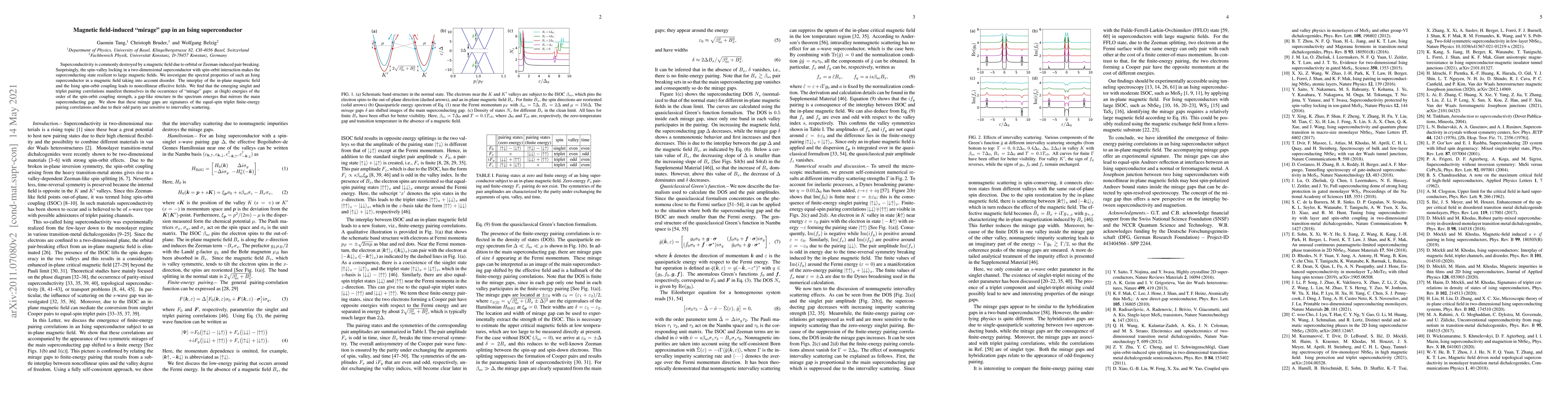 Superconductivity is commonly destroyed by a magnetic field due to orbital or Zeeman-induced pair breaking. Surprisingly, the spin-valley locking in a two-dimensional superconductor with spin-orbit interaction makes the superconducting state resilient to large magnetic fields. We investigate the spectral properties of such an Ising superconductor in a magnetic field taking into account disorder. The interplay of the in-plane magnetic field and the Ising spin-orbit coupling leads to noncollinear effective fields. We find that the emerging singlet and triplet pairing correlations manifest themselves in the occurrence of "mirage" gaps: at (high) energies of the order of the spin-orbit coupling strength, a gap-like structure in the spectrum emerges that mirrors the main superconducting gap. We show that these mirage gaps are signatures of the equal-spin triplet finite-energy pairing correlations and due to their odd parity are sensitive to intervalley scattering.