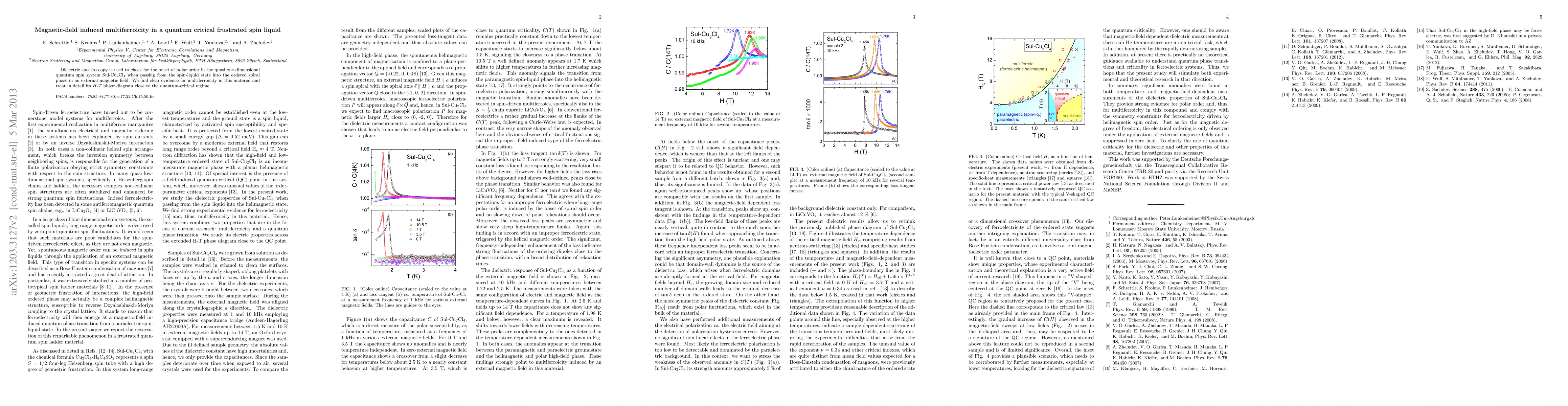 Dielectric spectroscopy is used to check for the onset of polar order in the quasi one-dimensional quantum spin system Sul-Cu2Cl4 when passing from the spin-liquid state into the ordered spiral phase in an external magnetic field. We find clear evidence for multiferroicity in this material and treat in detail its H-T phase diagram close to the quantum-critical regime.