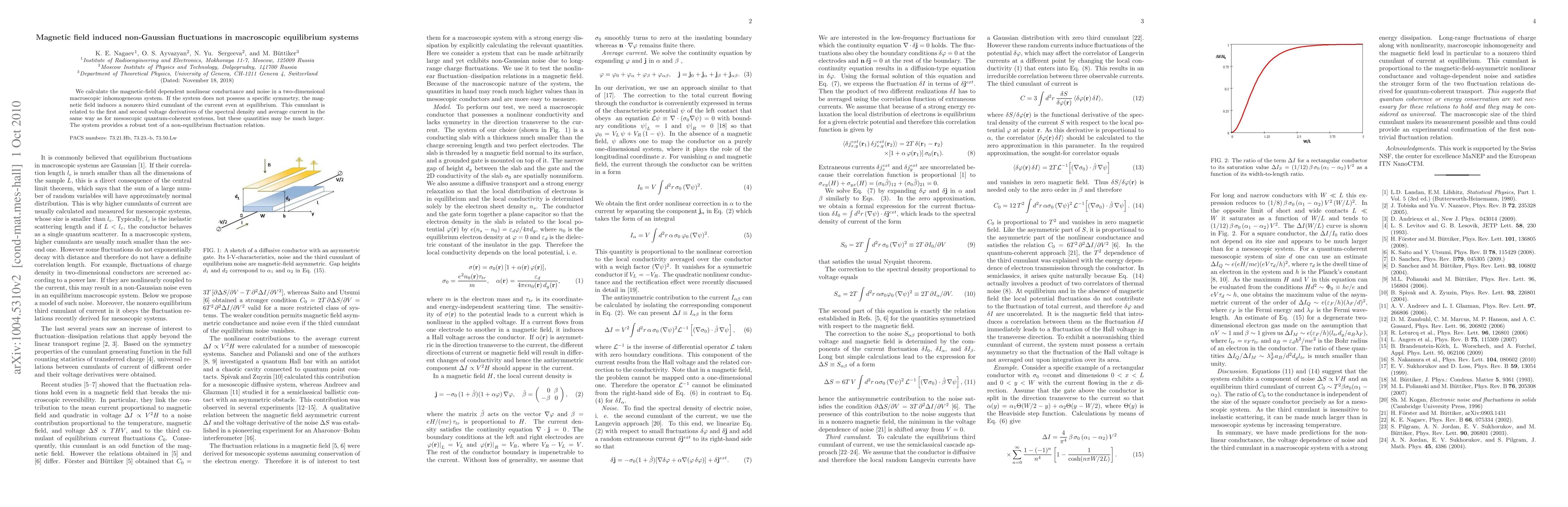 Research shows that a magnetic field can induce non-Gaussian fluctuations in macroscopic equilibrium systems, leading to nonzero third cumulants of the current even at thermal equilibrium. This effect provides a robust test of a non-equilibrium fluctuation relation.