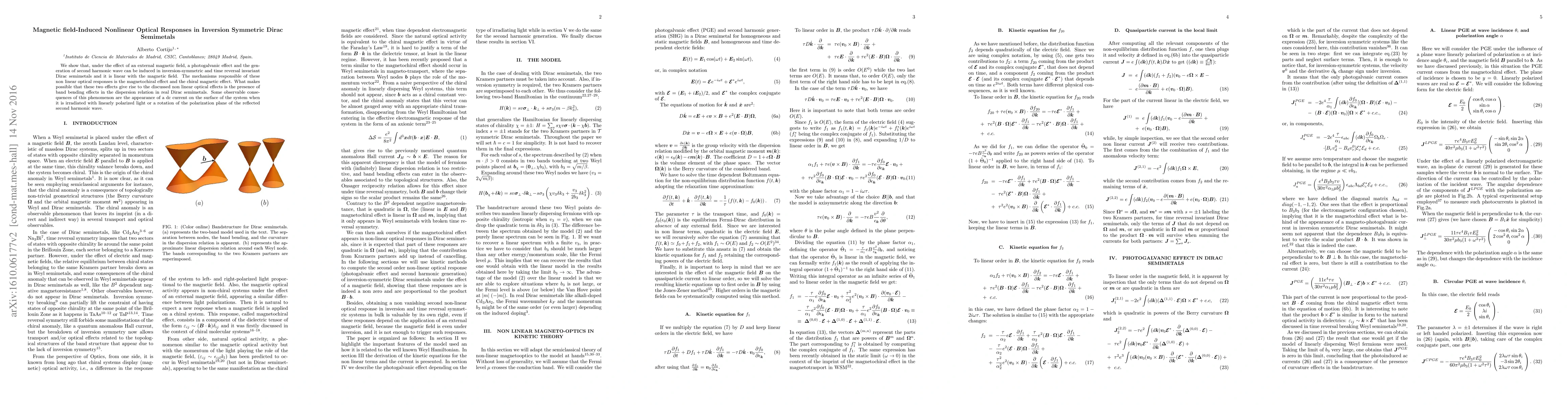 Summary: Under an external magnetic field, inversion-symmetric Dirac semimetals exhibit photogalvanic effects and second harmonic generation via magnetochiral effects, driven by band bending, leading to observable dc currents and polarization rotations.