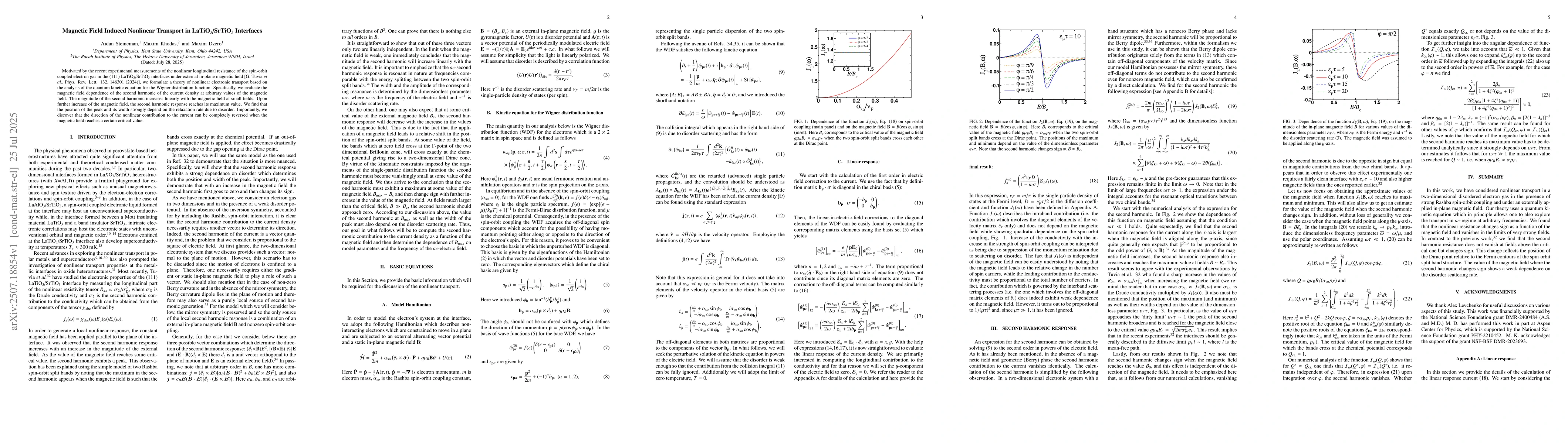 Motivated by the recent experimental measurements of the nonlinear longitudinal resistance of the spin-orbit coupled electron gas in the (111) LaTiO$_3$/SrTiO$_3$ interfaces under external in-plane magnetic field [G. Tuvia \emph{et al.}, Phys. Rev. Lett. 132, 146301 (2024)], we formulate a theory of nonlinear electronic transport based on the analysis of the quantum kinetic equation for the Wigner distribution function. Specifically, we evaluate the magnetic field dependence of the second harmonic of the current density at arbitrary values of the magnetic field. The magnitude of the second harmonic increases linearly with the magnetic field at small fields. Upon further increase of the magnetic field, the second harmonic response reaches its maximum value. We find that the position of the peak and its width strongly depend on the relaxation rate due to disorder. Importantly, we discover that the direction of the nonlinear contribution to the current can be completely reversed when the magnetic field reaches a certain critical value.