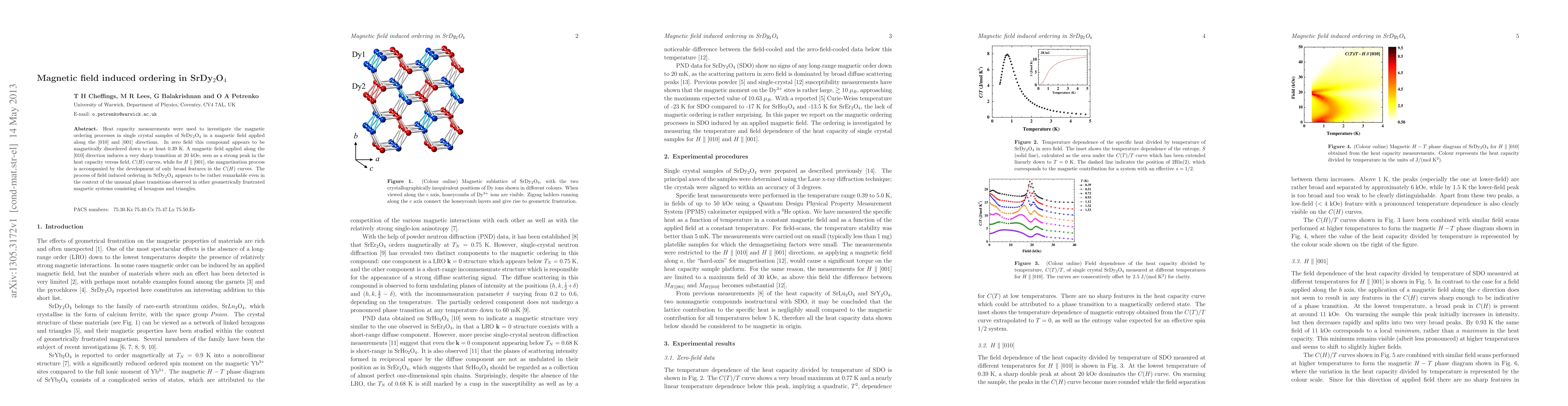 Heat capacity measurements were used to investigate the magnetic ordering processes in single crystal samples of SrDy2O4 in a magnetic field applied along the [010] and [001] directions. In zero field this compound appears to be magnetically disordered down to at least 0.39 K. A magnetic field applied along the [010] direction induces a very sharp transition at 20 kOe, seen as a strong peak in the heat capacity versus field, C(H) curves, while for H // [001], the magnetisation process is accompanied by the development of only broad features in the C(H) curves. The process of field induced ordering in \sdo\ appears to be rather remarkable even in the context of the unusual phase transitions observed in other geometrically frustrated magnetic systems consisting of hexagons and triangles.