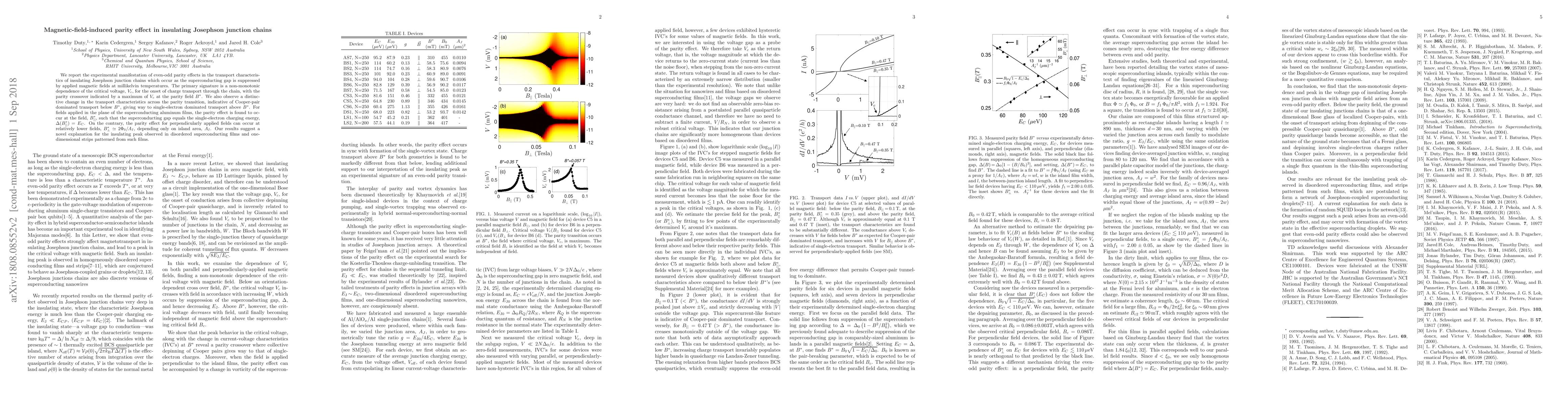 This paper reports the experimental observation of even-odd parity effects in insulating Josephson junction chains, where the critical voltage for charge transport shows a non-monotonic dependence on applied magnetic fields, indicating a transition from Cooper-pair to single-electron dominated transport. The study reveals distinct transport behaviors at the parity field, providing insights into the insulating peak in disordered superconducting films.