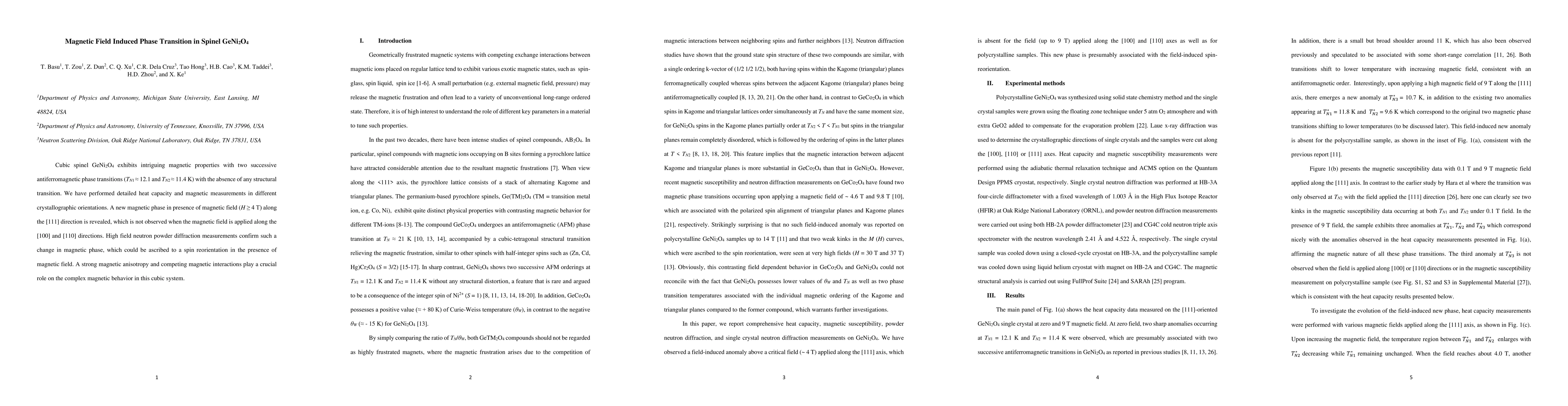 Cubic spinel GeNi2O4 exhibits intriguing magnetic properties with two successive antiferromagnetic phase transitions (TN1 12.1 and TN2 11.4 K) with the absence of any structural transition. We have performed detailed heat capacity and magnetic measurements in different crystallographic orientations. A new magnetic phase in presence of magnetic field (H > 4 T) along the [111] direction is revealed, which is not observed when the magnetic field is applied along the [100] and [110] directions. High field neutron powder diffraction measurements confirm such a change in magnetic phase, which could be ascribed to a spin reorientation in the presence of magnetic field. A strong magnetic anisotropy and competing magnetic interactions play a crucial role on the complex magnetic behavior in this cubic system.