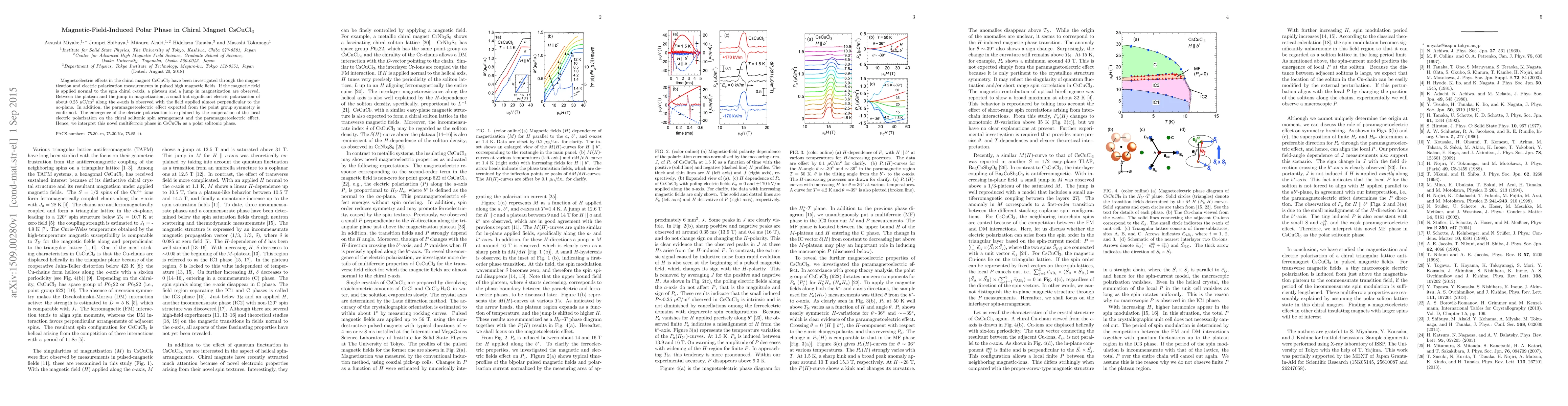 The research investigates the chiral magnet CsCuCl$_3$ and discovers a magnetic-field-induced polar phase. Applying a field normal to the spin chiral c-axis results in a magnetization plateau, jump, and a small electric polarization of 0.25 {mu}C/m$^2$ along the a-axis. This novel multiferroic phase, termed a polar solitonic phase, emerges from the cooperation of local electric polarization on chiral solitonic spin arrangements and the paramagnetoelectric effect.