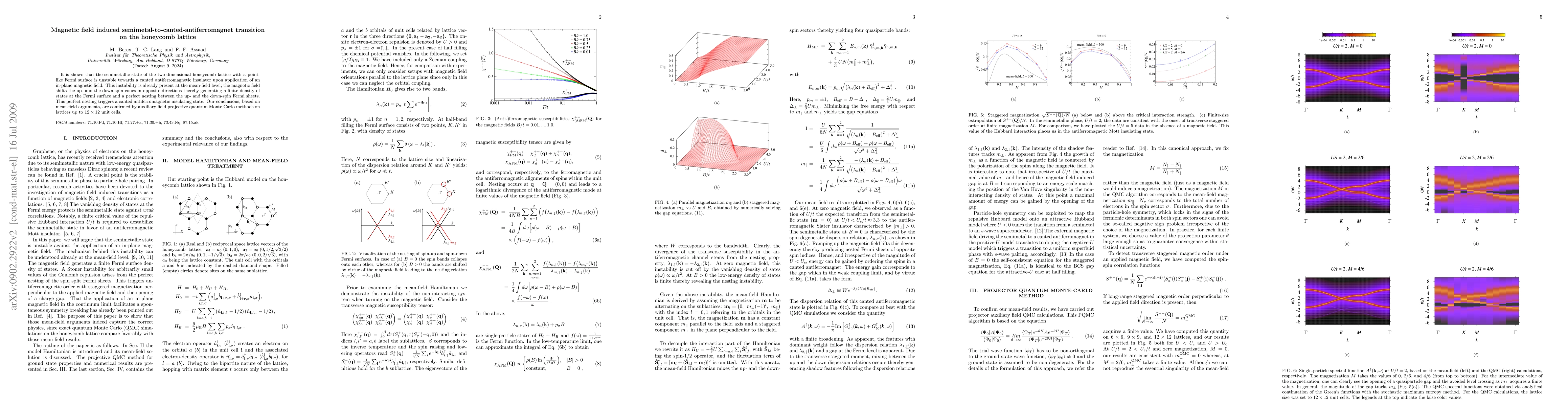 This research demonstrates that a semimetallic state on a honeycomb lattice transitions to a canted antiferromagnetic insulator under an in-plane magnetic field. The transition is verified through mean-field analysis and quantum Monte Carlo simulations on lattices up to 12x12 unit cells, revealing perfect nesting between up- and down-spin Fermi sheets as the driving mechanism.