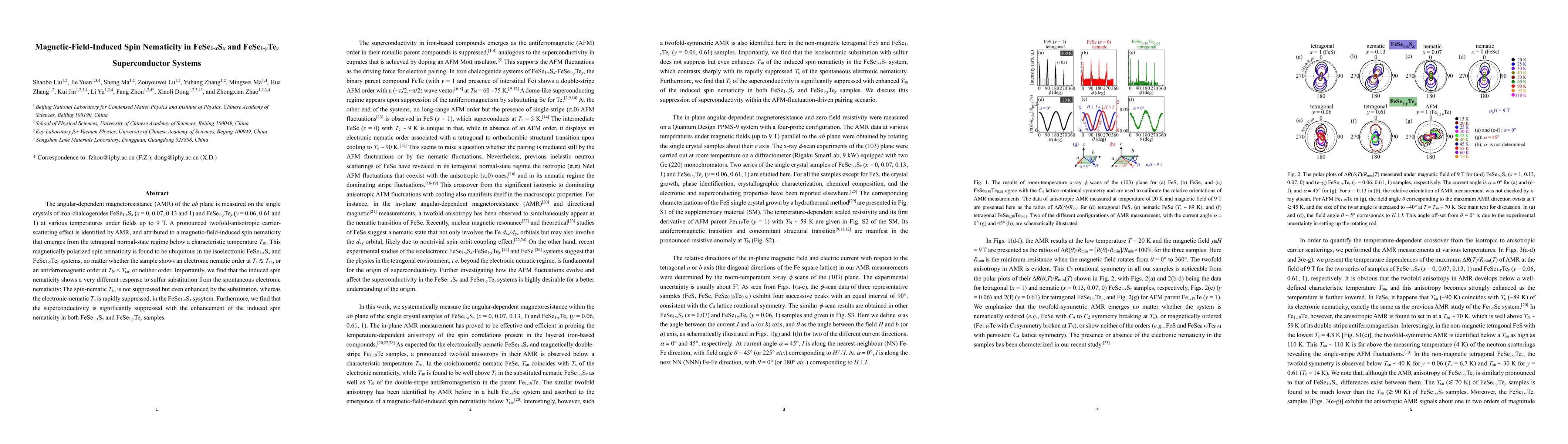 This study reveals magnetic-field-induced spin nematicity in FeSe1-xSx and FeSe1-yTey superconductor systems, identified via angular-dependent magnetoresistance, which emerges below a temperature Tsn. The spin nematicity is ubiquitous regardless of the electronic or magnetic order, and its enhancement does not suppress but rather boosts Tsn, contrasting with the suppression of spontaneous electronic nematicity. Superconductivity is significantly suppressed with the enhancement of induced spin nematicity.