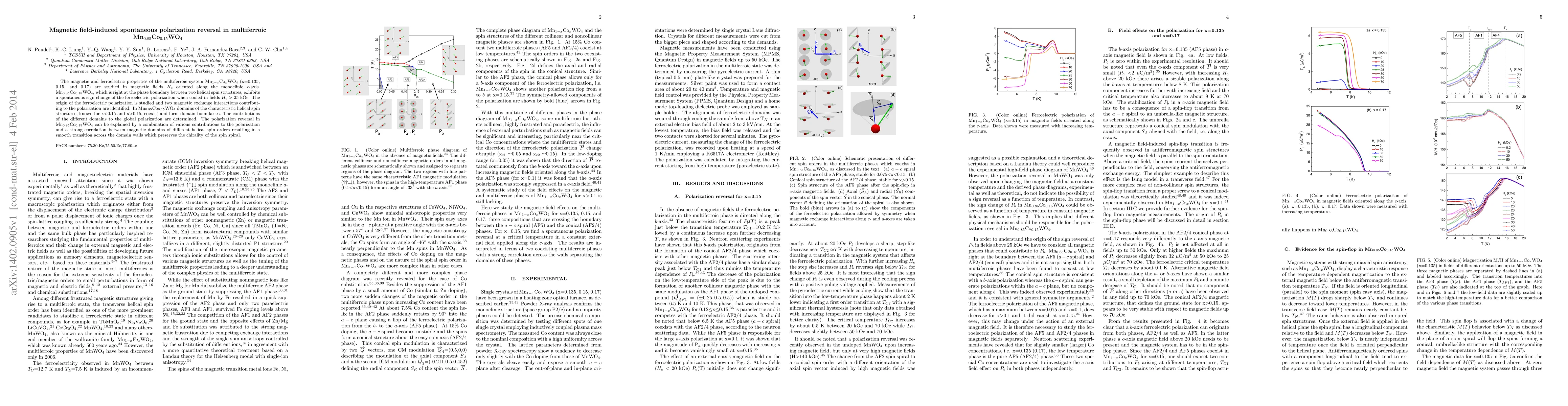 The magnetic and ferroelectric properties of the multiferroic system Mn$_{1-x}$Co$_x$WO$_4$ (x=0.135, 0.15, and 0.17) are studied in magnetic fields $H_c$ oriented along the monoclinic $c$-axis. Mn$_{0.85}$Co$_{0.15}$WO$_4$, which is right at the phase boundary between two helical spin structures, exhibits a spontaneous sign change of the ferroelectric polarization when cooled in fields $H_c>$ 25 kOe. The origin of the ferroelectric polarization is studied and two magnetic exchange interactions contributing to the polarization are identified. In Mn$_{0.85}$Co$_{0.15}$WO$_4$ domains of the characteristic helical spin structures, known for x$<$0.15 and x$>$0.15, coexist and form domain boundaries. The contributions of the different domains to the global polarization are determined. The polarization reversal in Mn$_{0.85}$Co$_{0.15}$WO$_4$ can be explained by a combination of various contributions to the polarization and a strong correlation between magnetic domains of different helical spin orders resulting in a smooth transition across the domain walls which preserves the chirality of the spin spiral.