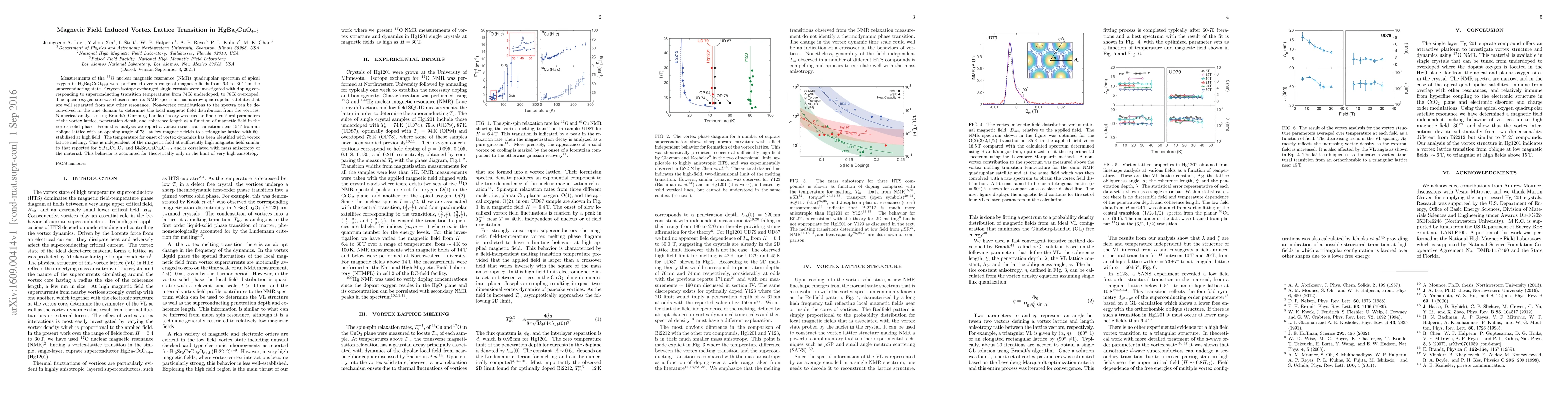 This study investigates the vortex lattice transition in HgBa$_{2}$CuO$_{4+\delta}$ using $^{17}$O NMR spectroscopy, revealing a structural change from an oblique to a triangular vortex lattice at around 15 T. The transition correlates with vortex lattice melting and mass anisotropy.