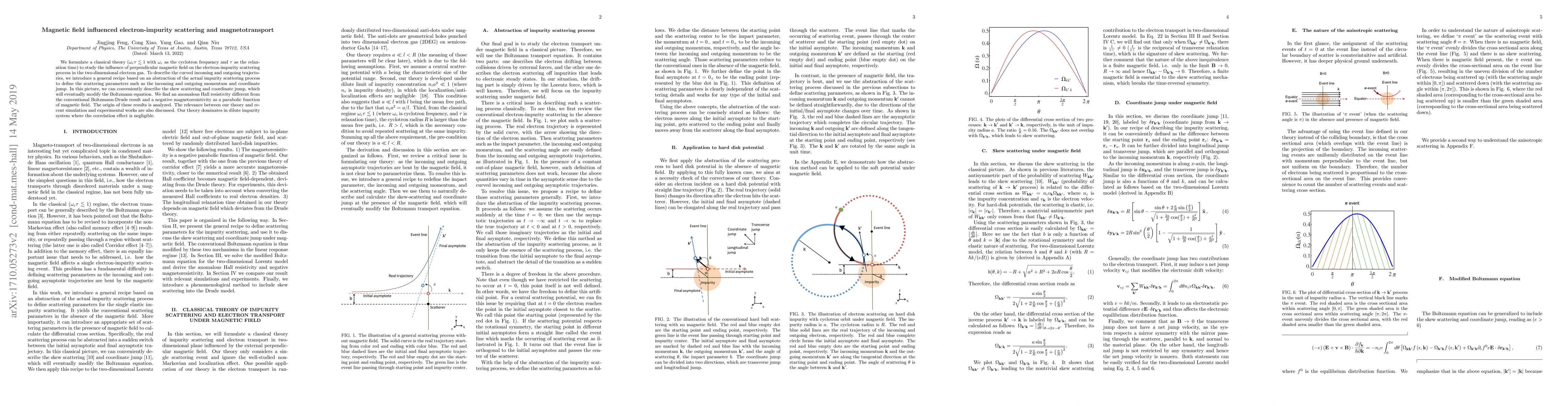 We formulate a quasiclassical theory ($\omega_c\tau \lesssim 1$ with $\omega_c$ as the cyclotron frequency and $\tau$ as the relaxation time) to study the influence of magnetic field on electron-impurity scattering process in the two-dimensional electron gas. We introduce a general recipe based on an abstraction of the detailed impurity scattering process to define the scattering parameter such as the incoming and outgoing momentum and coordinate jump. In this picture, we can conveniently describe the skew scattering and coordinate jump, which will eventually modify the Boltzmann equation. We find an anomalous Hall resistivity different from the conventional Boltzmann-Drude result and a negative magnetoresistivity parabolic in magnetic field. The origin of these results has been analyzed. The relevance between our theory and recent simulation and experimental works is also discussed. Our theory dominates in dilute impurity system where the correlation effect is negligible.