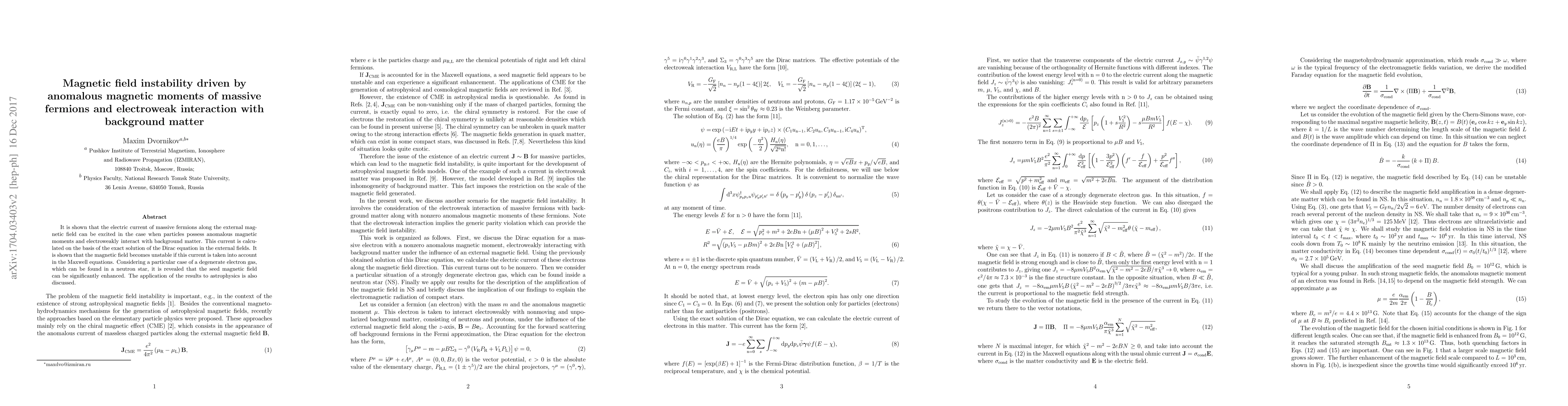 This paper demonstrates that massive fermions with anomalous magnetic moments and electroweak interactions can generate an electric current that destabilizes magnetic fields, as shown through exact solutions of the Dirac equation. The findings suggest that such currents can significantly enhance seed magnetic fields in neutron stars, with implications for astrophysical magnetic field evolution.