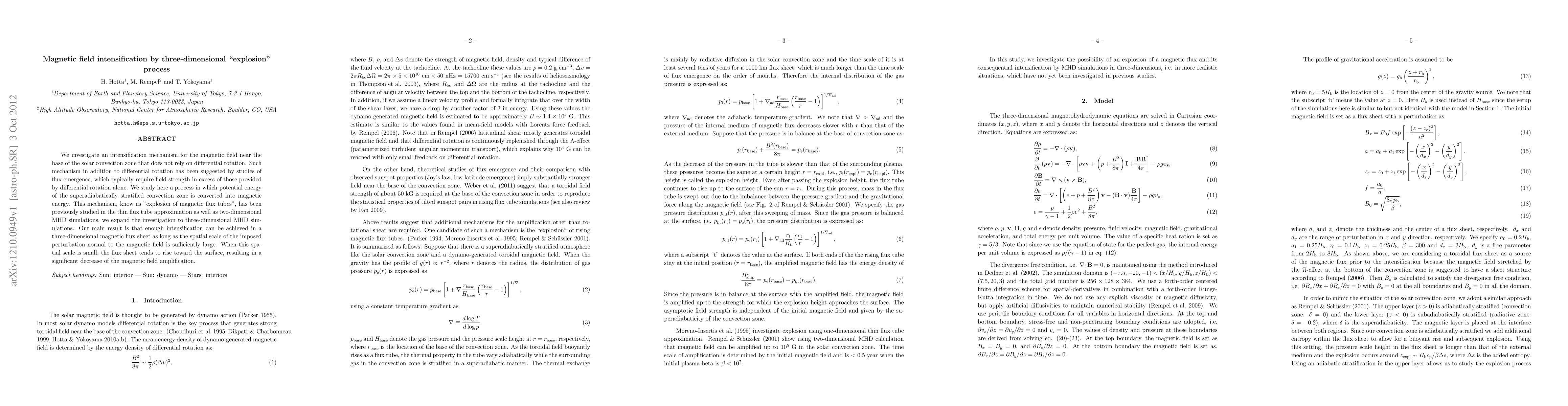 We investigate an intensification mechanism for the magnetic field near the base of the solar convection zone that does not rely on differential rotation. Such mechanism in addition to differential rotation has been suggested by studies of flux emergence, which typically require field strength in excess of those provided by differential rotation alone. We study here a process in which potential energy of the superadiabatically stratified convection zone is converted into magnetic energy. This mechanism, know as explosion of magnetic flux tubes, has been previously studied in the thin flux tube approximation as well as two-dimensional MHD simulations, we expand the investigation to three-dimensional MHD simulations. Our main result is that enough intensification can be achieved in a three-dimensional magnetic flux sheet as long as the spatial scale of the imposed perturbation normal to the magnetic field is sufficiently large. When this spatial scale is small, the flux sheet tends to rise toward the surface, resulting in a significant decrease of the magnetic field amplification.