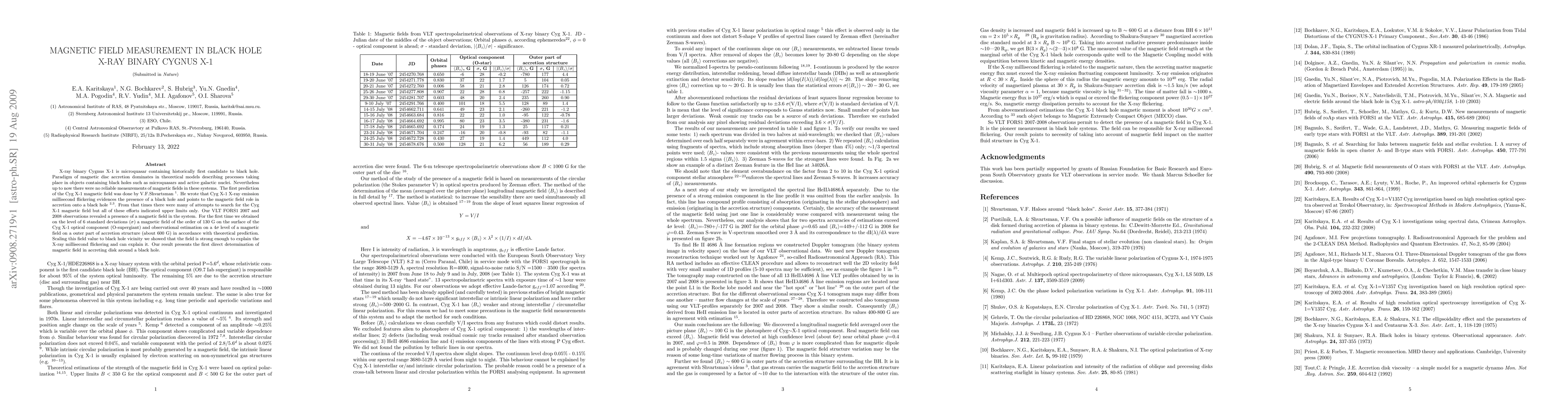 X-ray binary Cygnus X-1 is microquasar containing historically first candidate to black hole. Paradigm of magnetic disc accretion dominates in theoretical models describing processes taking place in objects containing black holes such as microquasars and active galactic nuclei. Nevertheless up to now there were no reliable measurements of magnetic fields in these systems. The first prediction of the Cyg X-1 magnetic field was done by V.F.Shvartsman. He wrote that Cyg X-1 X-ray emission millisecond flickering evidences the presence of a black hole and points to the magnetic field role in accretion onto a black hole. From that times there were many of attempts to search for the Cyg X-1 magnetic field but all of these efforts indicated upper limits only. Our VLT FORS1 2007 and 2008 observations revealed a presence of a magnetic field in the system. For the first time we obtained on the level of 6 standard deviations a magnetic field of the order of 130 G on the surface of the Cyg X-1 optical component (O-supergiant) and observational estimation on a 4 sigma level of a magnetic field on a outer part of accretion structure (about 600 G) in accordance with theoretical prediction. Scaling this field value to black hole vicinity we showed that the field is strong enough to explain the X-ray millisecond flickering and can explain it. Our result presents the first direct determination of magnetic field in accreting disk around a black hole.
