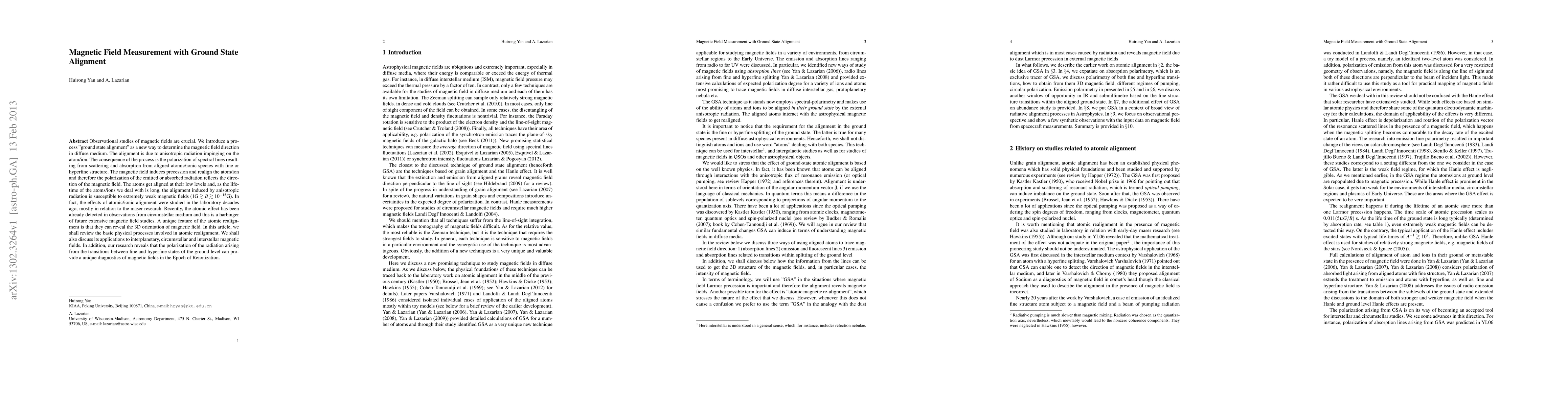 Observational studies of magnetic fields are crucial. We introduce a process "ground state alignment" as a new way to determine the magnetic field direction in diffuse medium. The alignment is due to anisotropic radiation impinging on the atom/ion. The consequence of the process is the polarization of spectral lines resulting from scattering and absorption from aligned atomic/ionic species with fine or hyperfine structure. The magnetic field induces precession and realign the atom/ion and therefore the polarization of the emitted or absorbed radiation reflects the direction of the magnetic field. The atoms get aligned at their low levels and, as the life-time of the atoms/ions we deal with is long, the alignment induced by anisotropic radiation is susceptible to extremely weak magnetic fields ($1{\rm G}\gtrsim B\gtrsim 10^{-15}$G). In fact, the effects of atomic/ionic alignment were studied in the laboratory decades ago, mostly in relation to the maser research. Recently, the atomic effect has been already detected in observations from circumstellar medium and this is a harbinger of future extensive magnetic field studies. A unique feature of the atomic realignment is that they can reveal the 3D orientation of magnetic field. In this article, we shall review the basic physical processes involved in atomic realignment. We shall also discuss its applications to interplanetary, circumstellar and interstellar magnetic fields. In addition, our research reveals that the polarization of the radiation arising from the transitions between fine and hyperfine states of the ground level can provide a unique diagnostics of magnetic fields in the Epoch of Reionization.