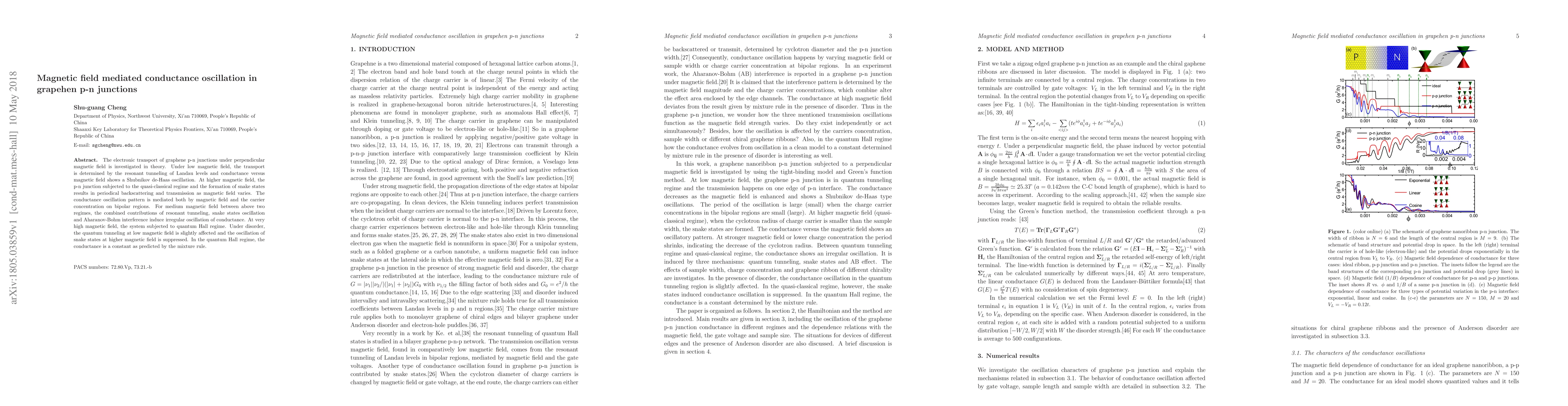 This paper investigates the electronic transport in graphene p-n junctions under a perpendicular magnetic field, revealing conductance oscillations driven by resonant tunneling, snake states, and quantum Hall effects at varying magnetic field strengths. Disorder impacts low-field tunneling and high-field snake state oscillations, while the quantum Hall regime shows constant conductance.