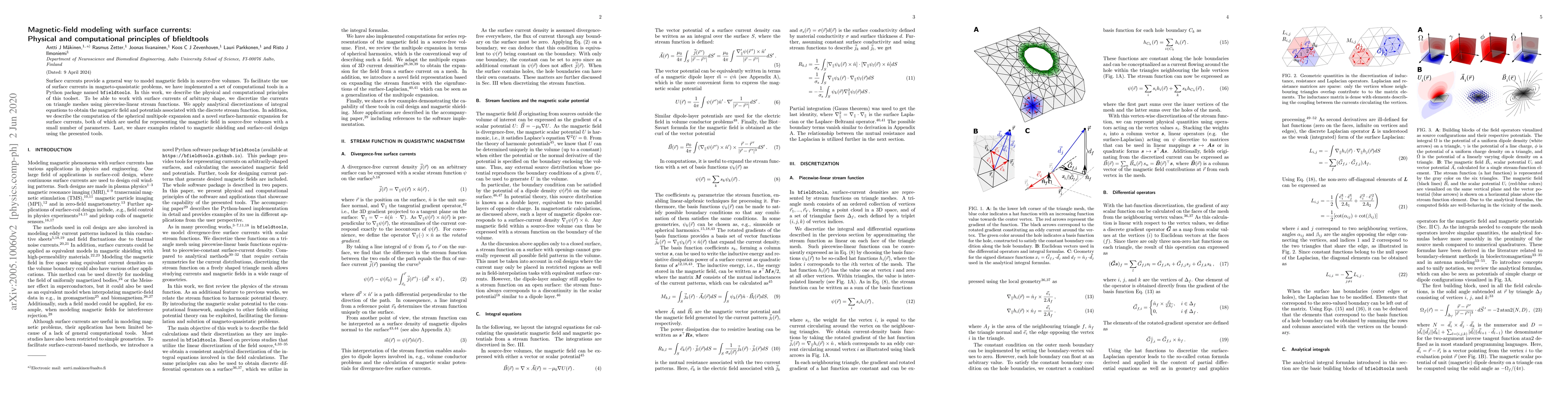 Surface currents provide a general way to model static magnetic fields in source-free volumes. To facilitate the use of surface currents in magneto-quasistatic problems, we have implemented a set of computational tools in a Python package named bfieldtools. In this work, we describe the physical and computational principles of this toolset. To be able to work with surface currents of arbitrary shape, we discretize the currents on triangle meshes using piecewise-linear stream functions. We apply analytical discretizations of integral equations to obtain the magnetic field and potentials associated with the discrete stream function. In addition, we describe the computation of the spherical multipole expansion and a novel surface-harmonic expansion for surface currents, both of which are useful for representing the magnetic field in source-free volumes with a small number of parameters. Last, we share examples related to magnetic shielding and surface-coil design using the presented tools.