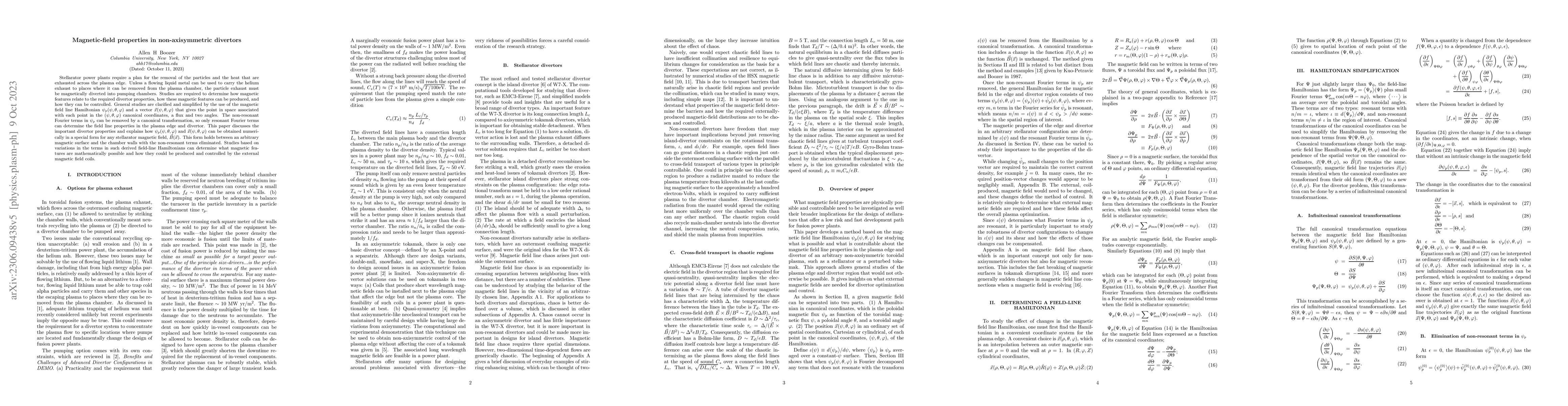 Stellarator power plants require a plan for the removal of the particles and the heat that are exhausted across the plasma edge. Unless a flowing liquid metal can be used to carry the helium exhaust to places where it can be removed from the plasma chamber, the particle exhaust must be magnetically diverted into pumping chambers. Studies are required to determine how magnetic features relate to the required divertor properties, how these magnetic features can be produced, and how they can be controlled. General studies are clarified and simplified by the use of the magnetic field line Hamiltonian $\psi_p(\psi,\theta,\varphi)$ and a vector $\vec{x}(\psi,\theta,\varphi)$ that gives the point in space associated with each point in the $(\psi,\theta,\varphi)$ canonical coordinates, a flux and two angles. The non-resonant Fourier terms in $\psi_p$ can be removed by a canonical transformation, so only resonant Fourier terms can determine the field line properties in the plasma edge and divertor. This paper discusses the important divertor properties and explains how $\psi_p(\psi,\theta,\varphi)$ and $\vec{x}(\psi,\theta,\varphi)$ can be obtained numerically in a special form for any stellarator magnetic field, $\vec{B}(\vec{x})$. This form holds between an arbitrary magnetic surface and the chamber walls with the non-resonant terms eliminated. Studies based on variations in the terms in such derived field-line Hamiltonians can determine what magnetic features are mathematically possible and how they could be produced and controlled by the external magnetic field coils.