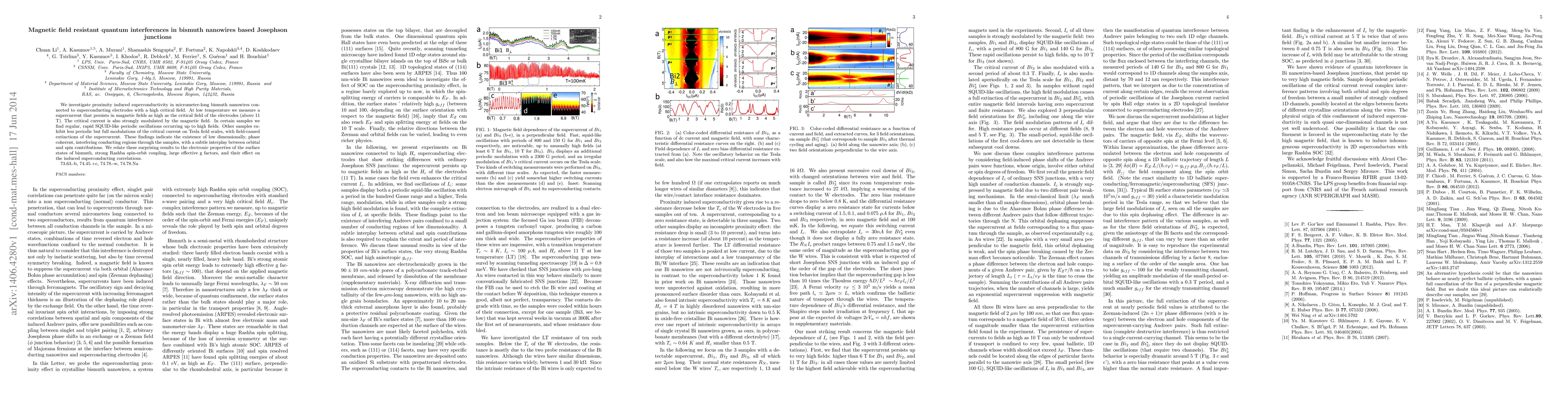 We investigate proximity induced superconductivity in micrometer-long bismuth nanowires con- nected to superconducting electrodes with a high critical field. At low temperature we measure a supercurrent that persists in magnetic fields as high as the critical field of the electrodes (above 11 T). The critical current is also strongly modulated by the magnetic field. In certain samples we find regular, rapid SQUID-like periodic oscillations occurring up to high fields. Other samples ex- hibit less periodic but full modulations of the critical current on Tesla field scales, with field-caused extinctions of the supercurrent. These findings indicate the existence of low dimensionally, phase coherent, interfering conducting regions through the samples, with a subtle interplay between orbital and spin contributions. We relate these surprising results to the electronic properties of the surface states of bismuth, strong Rashba spin-orbit coupling, large effective g factors, and their effect on the induced superconducting correlations.