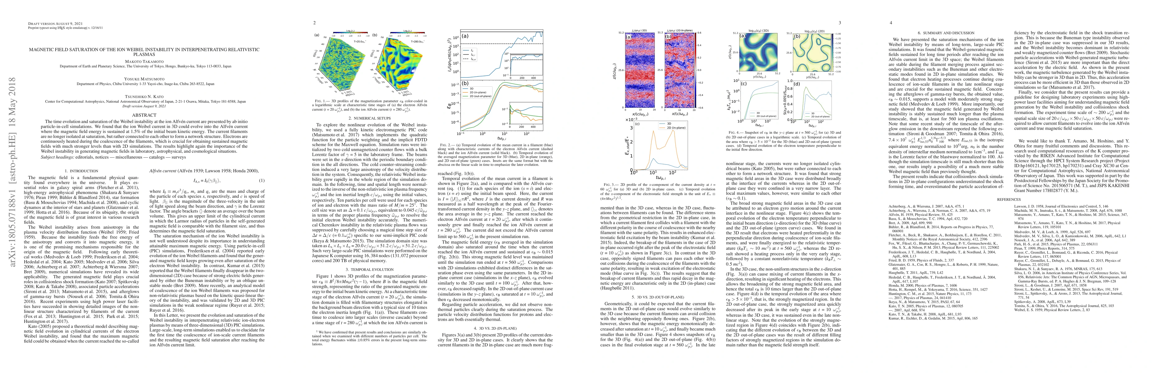 The time evolution and saturation of the Weibel instability at the ion Alfv\'en current are presented by ab initio particle-in-cell simulations. We found that the ion Weibel current in 3D could evolve into the Alfv\'en current where the magnetic field energy is sustained at 1.5\% of the initial beam kinetic energy. The current filaments are no longer isolated at saturation, but rather connected to each other to form a network structure. Electrons are continuously heated during the coalescence of the filaments, which is crucial for obtaining sustained magnetic fields with much stronger levels than with 2D simulations. The results highlight again the importance of the Weibel instability in generating magnetic fields in laboratory, astrophysical, and cosmological situations.