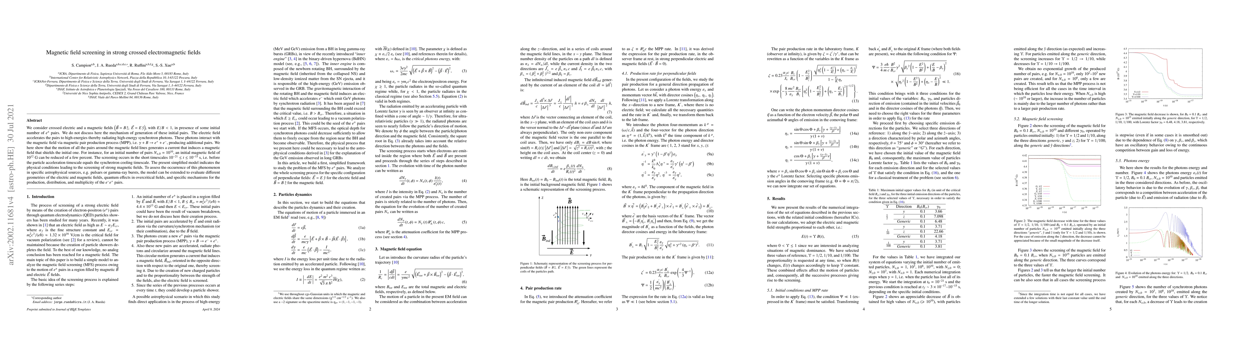 We consider crossed electric and a magnetic fields $\left(\vec{B}=B\,\hat{z},~\vec{E}=E\,\hat{y}\right)$, with $E/B<1$, in presence of some initial number of $e^{\pm}$ pairs. We do not discuss here the mechanism of generation of these initial pairs. The electric field accelerates the pairs to high-energies thereby radiating high-energy synchrotron photons. These photons interact with the magnetic field via magnetic pair production process (MPP), i.e. $\gamma+B\rightarrow e^{+}+e^{-}$, producing additional pairs. We here show that the motion of all the pairs around the magnetic field lines generates a current that induces a magnetic field that shields the initial one. For instance, for an initial number of pairs $N_{\pm,0}=10^{10}$, an initial magnetic field of $10^{12}$ G can be reduced of a few percent. The screening occurs in the short timescales $10^{-21}\leq t \leq 10^{-15}$ s, i.e. before the particle acceleration timescale equals the synchrotron cooling timescale. The present simplified model indicates the physical conditions leading to the screening of strong magnetic fields. To assess the occurrence of this phenomenon in specific astrophysical sources, e.g. pulsars or gamma-ray bursts, the model can be extended to evaluate different geometries of the electric and magnetic fields, quantum effects in overcritical fields, and specific mechanisms for the production, distribution, and multiplicity of the $e^{-}e^{+}$ pairs.