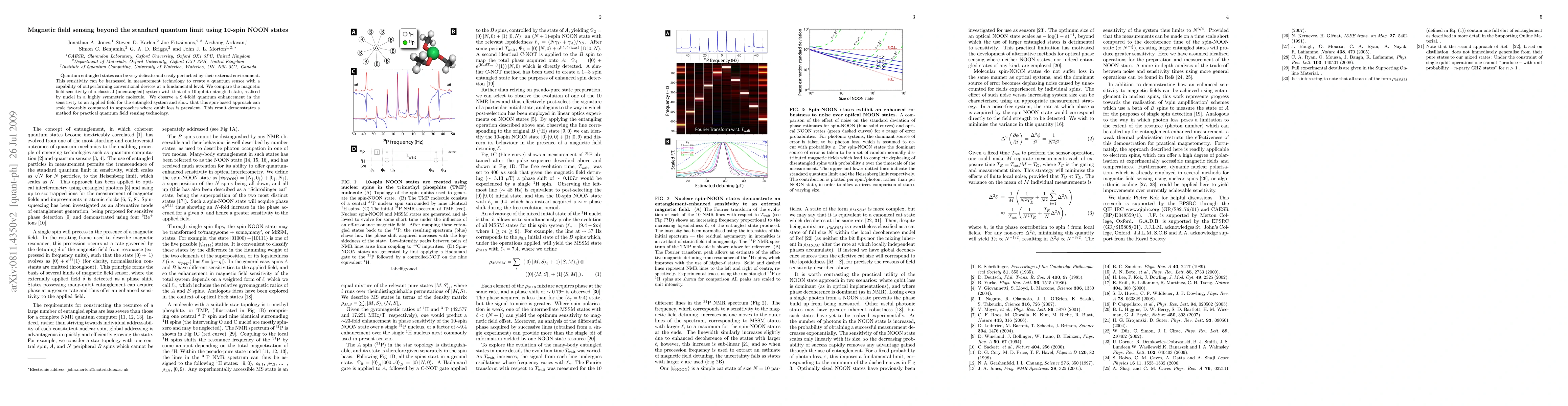 This paper demonstrates a 9.4-fold increase in magnetic field sensing sensitivity using 10-spin NOON states, surpassing the standard quantum limit and achieving the Heisenberg limit. This approach, employing nuclear spins in a highly symmetric molecule, shows promising scalability and enhanced precision over conventional methods.