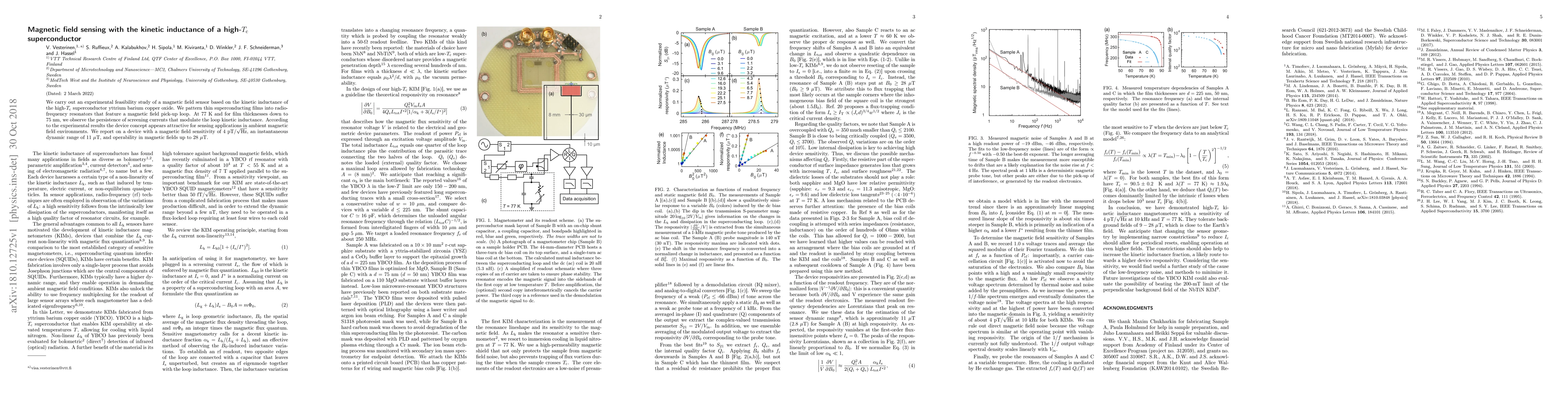 We carry out an experimental feasibility study of a magnetic field sensor based on the kinetic inductance of the high-$T_\mathrm{c}$ superconductor yttrium barium copper oxide. We pattern thin superconducting films into radio-frequency resonators that feature a magnetic field pick-up loop. At 77 K and for film thicknesses down to 75 nm, we observe the persistence of screening currents that modulate the loop kinetic inductance. According to the experimental results the device concept appears attractive for sensing applications in ambient magnetic field environments. We report on a device with a magnetic field sensitivity of 4 pT/Hz${}^{1/2}$, an instantaneous dynamic range of 11 $\mu$T, and operability in magnetic fields up to 28 $\mu$T.