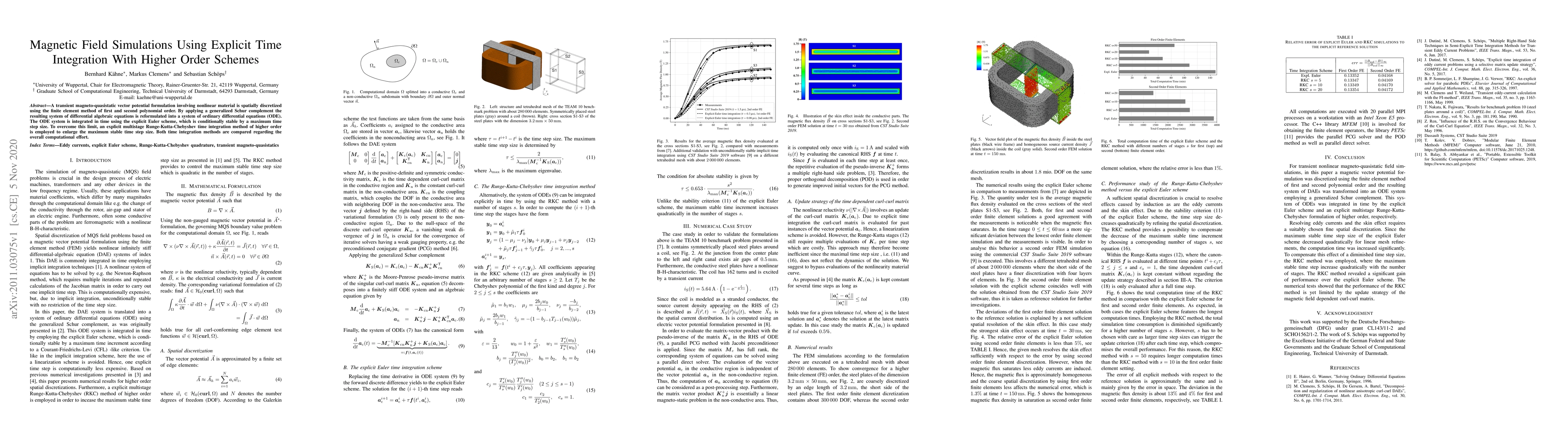 This paper presents a method using magnetic field simulations with explicit time integration, applying finite element discretization of first and second polynomial order for nonlinear materials. It reformulates the system into ODEs and compares the computational efficiency of explicit Euler and higher-order explicit multistage Runge-Kutta-Chebyshev methods.